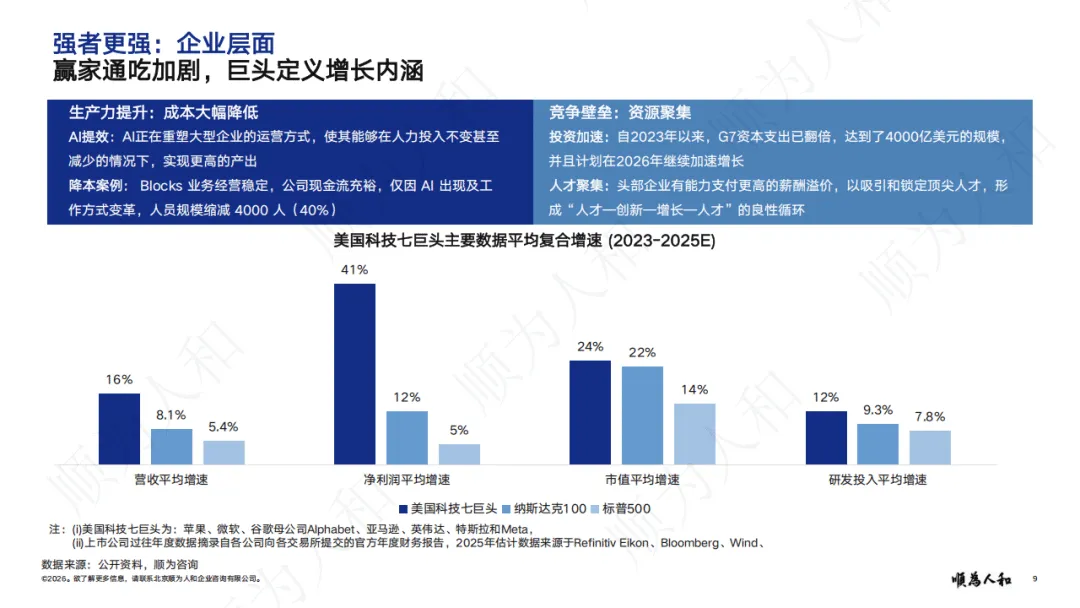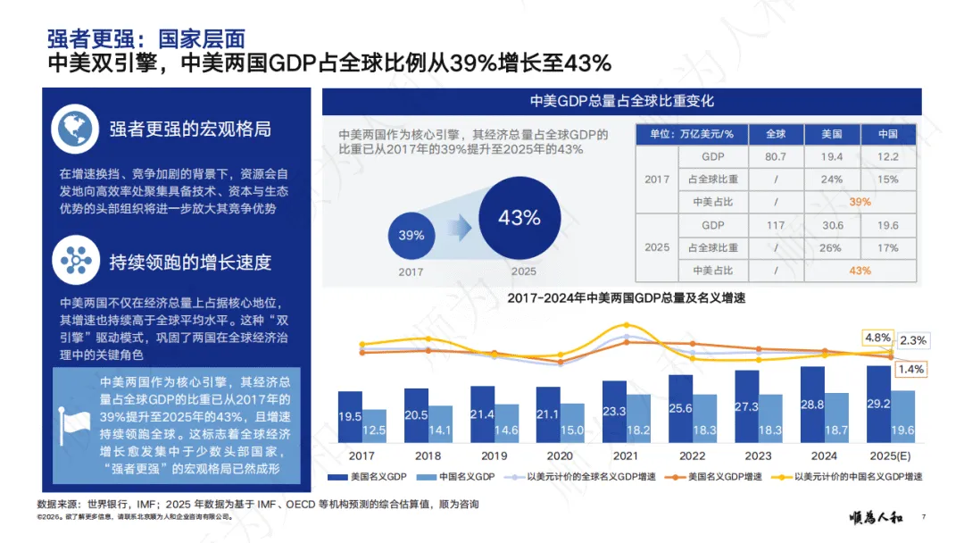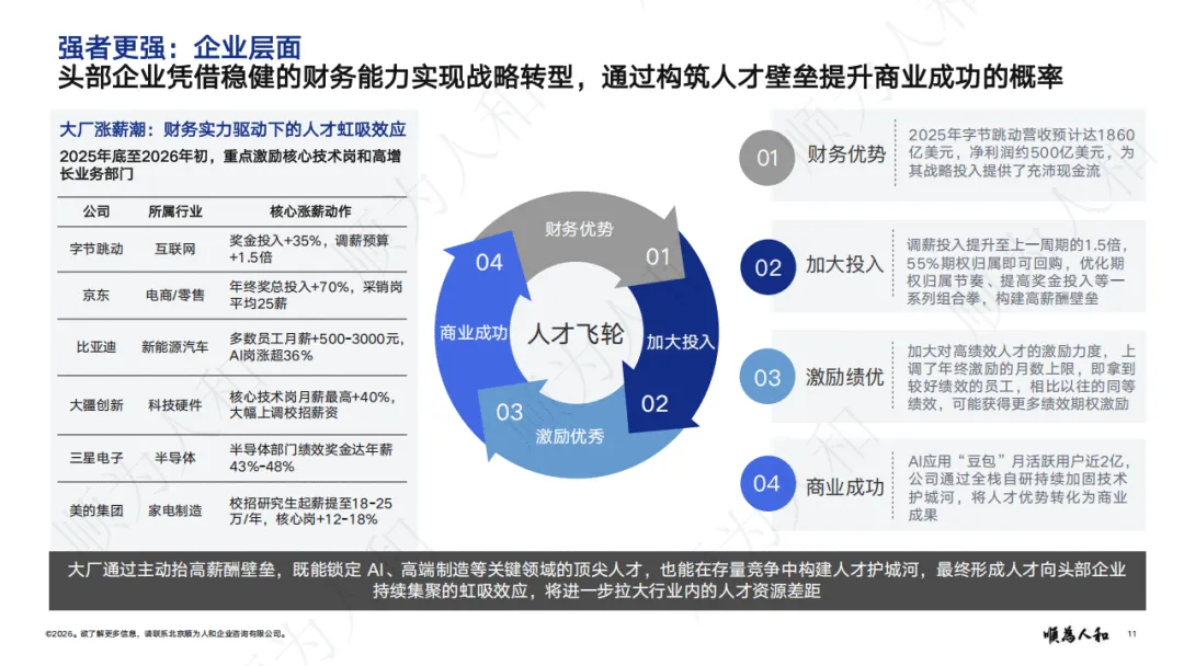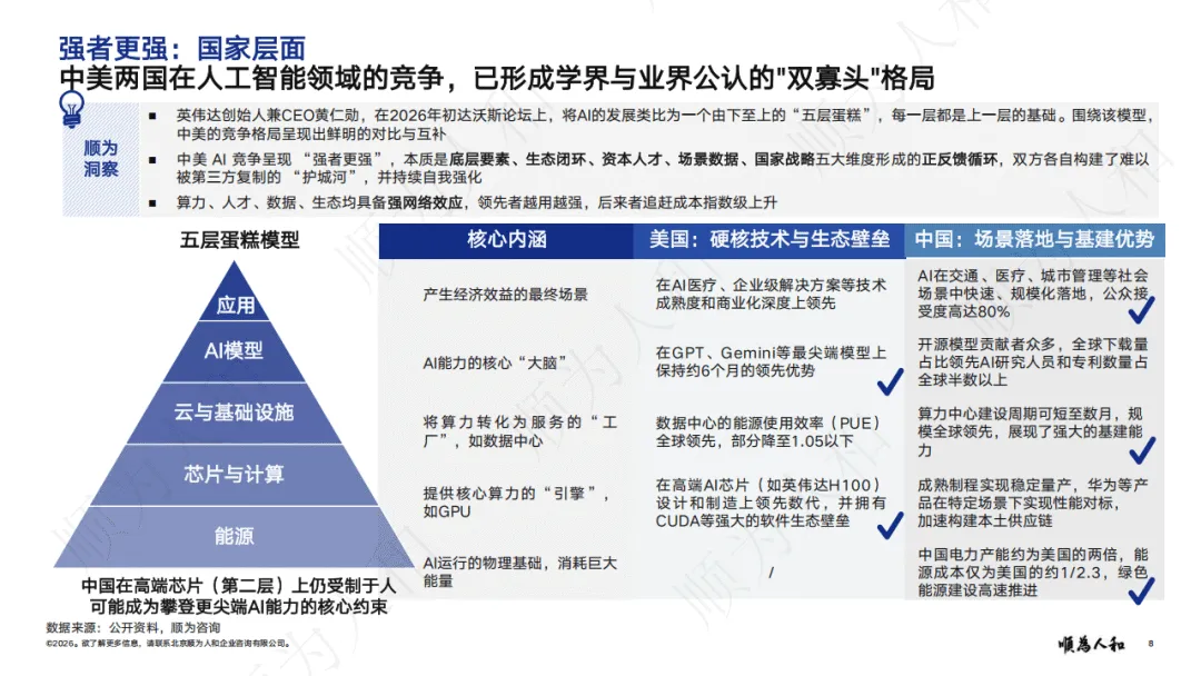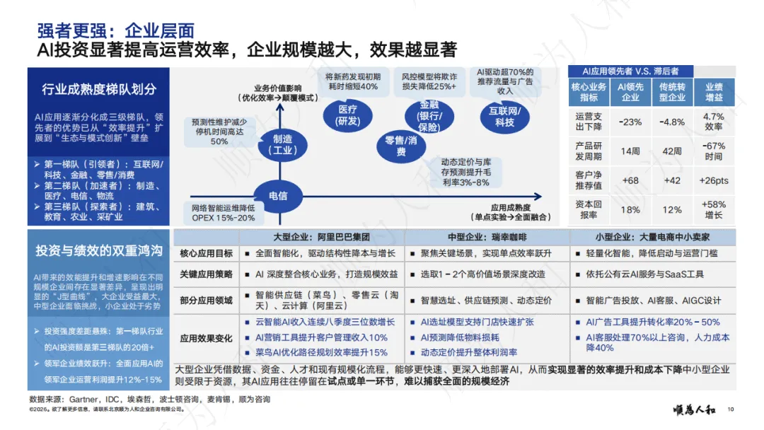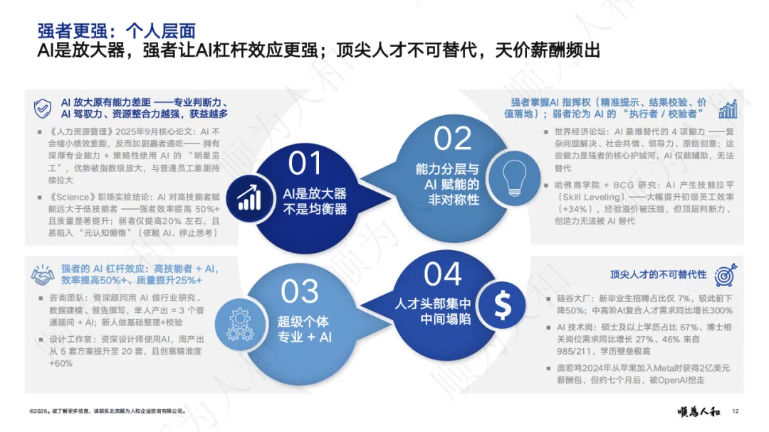 报告指出,全球经济转向价值驱动,强者更强成为核心格局。国家层面,中美形成经济与AI领域双寡头格局;企业层面,头部企业凭借AI、资金与人才优势拉大竞争差距,通过高薪锁定核心人才,AI应用带来显著降本增效,大型企业转型速度与收益远超中小企业;个人层面,AI放大能力差异,高技能人才借助AI实现效率指数级提升,人才向头部企业与核心岗位集中。