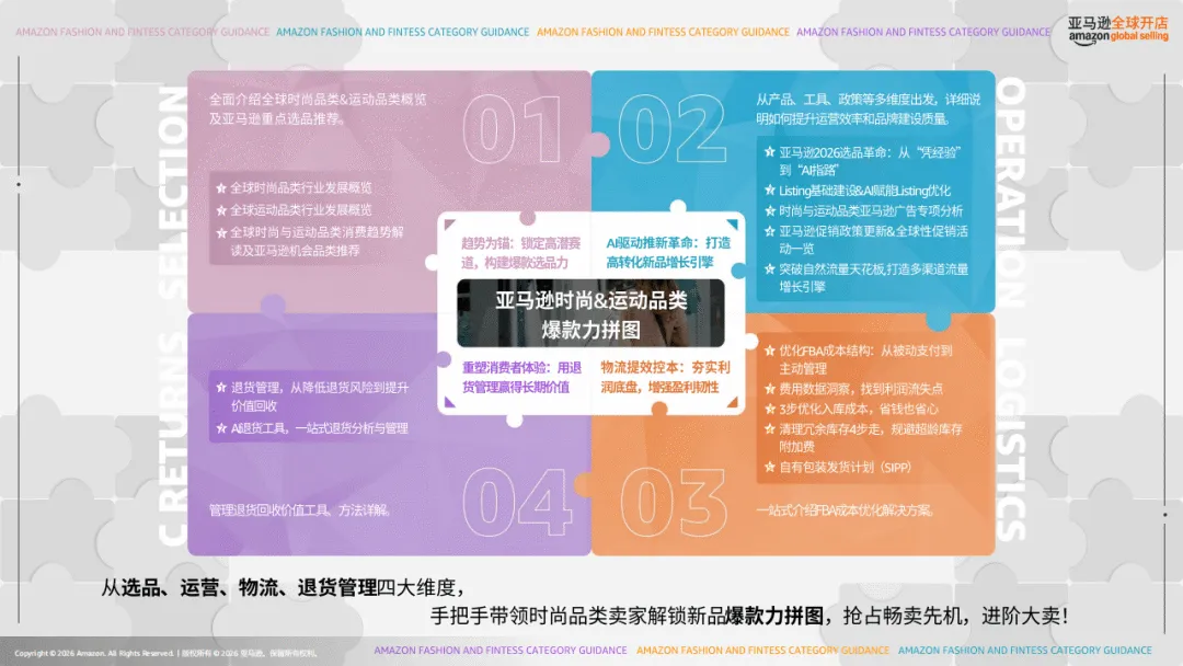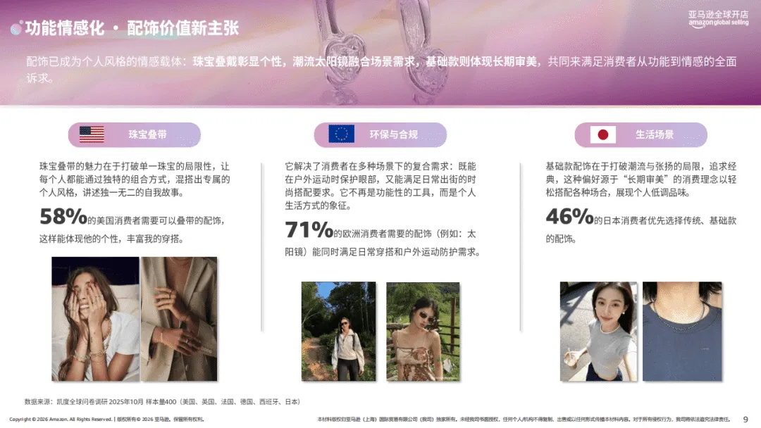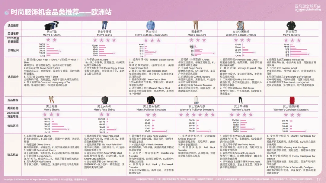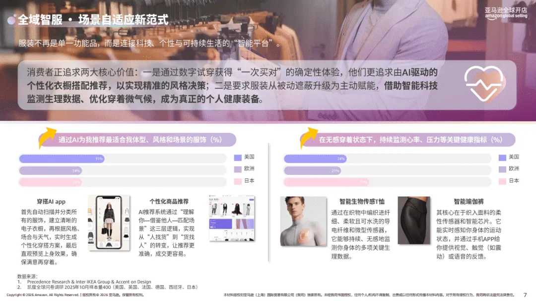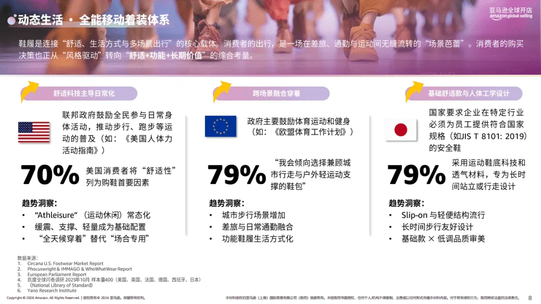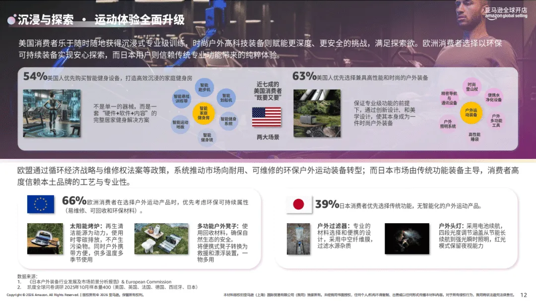 手册指出,全球时尚与运动品类消费需求持续升级,呈现智能化、场景化、可持续三大趋势。服装向智能健康装备转型,鞋履注重舒适与跨场景适配,配饰强调个性与环保,运动品类则偏向轻智能、空间高效化产品。美欧日市场偏好差异明显,美国热衷智能与时尚结合,欧洲重视环保耐用,日本偏爱传统专业与简约设计,卖家需针对性布局。