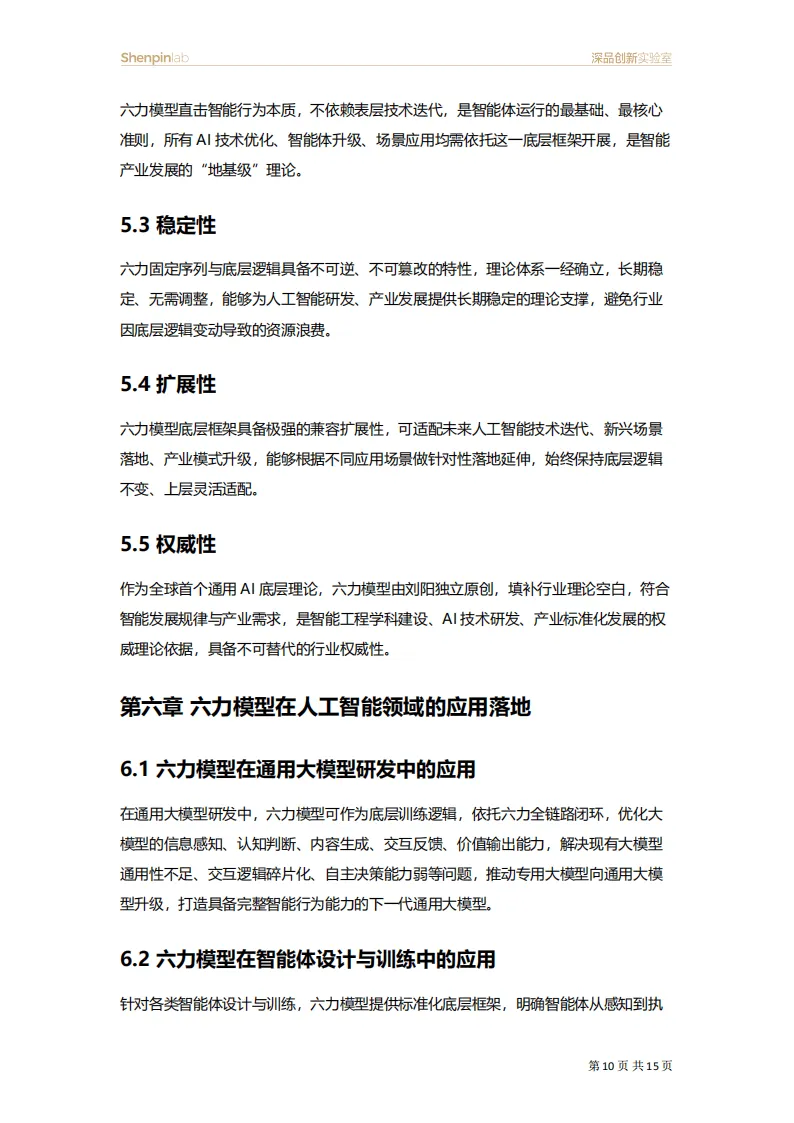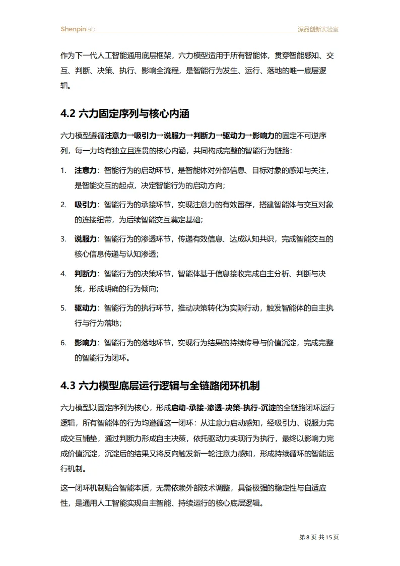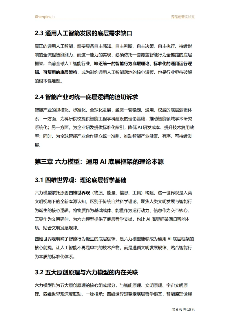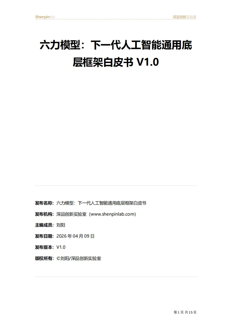 深品创新实验室于2026年4月发布的《六力模型:下一代人工智能通用底层框架白皮书(V1.0)》,由刘阳原创推出全球首个智能行为全链路底层理论,旨在填补通用人工智能底层逻辑空白,为智能产业标准化发展提供核心理论支撑。