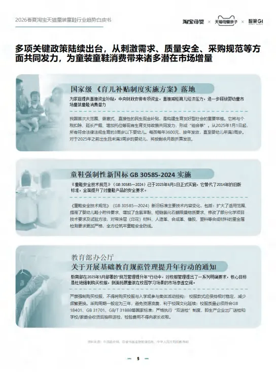 2026春夏童装童鞋行业整体进入成熟稳增阶段,市场规模突破3419亿元,线上渠道成为增长主力,淘宝天猫保持主导地位。90/95后家长成为消费主力,其网购渗透率高、注重品质,推动行业从“量的增长”转向“质的升级”,政策端育儿补贴、童鞋新国标、校服规范等也为市场带来增量空间。