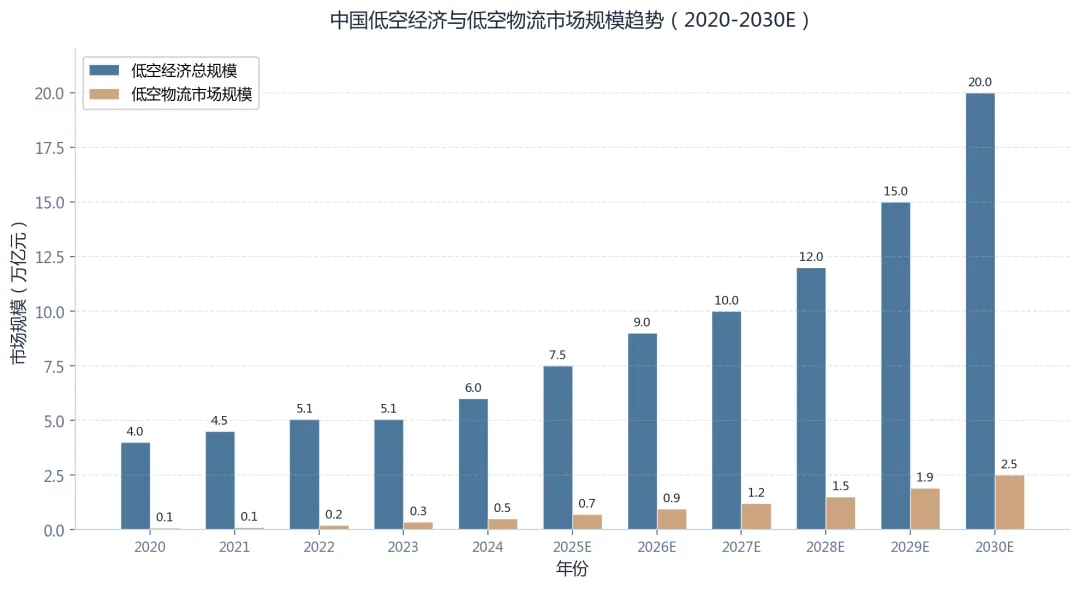 图 1:中国低空经济与低空物流市场规模趋势(2020-2030E)