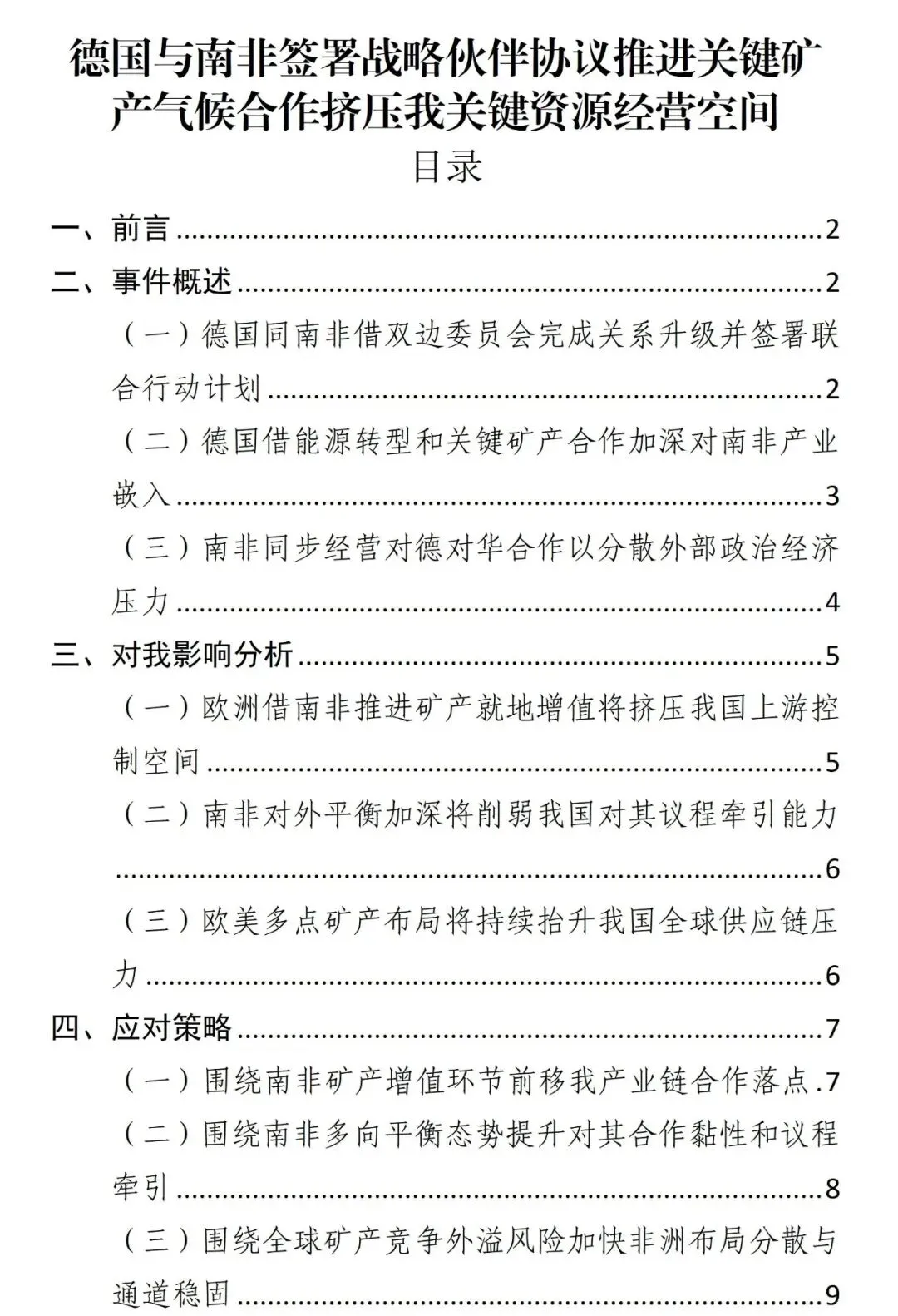 此前德国已推进北美关键矿产布局,欧盟持续推动供应链多元化。南非则同步经营对德融资合作与对华产业投资合作,以分散外部压力。相关动态对我国在非洲关键矿产供应链、绿色产业布局及对南非工作形成连带影响,需予以关注。