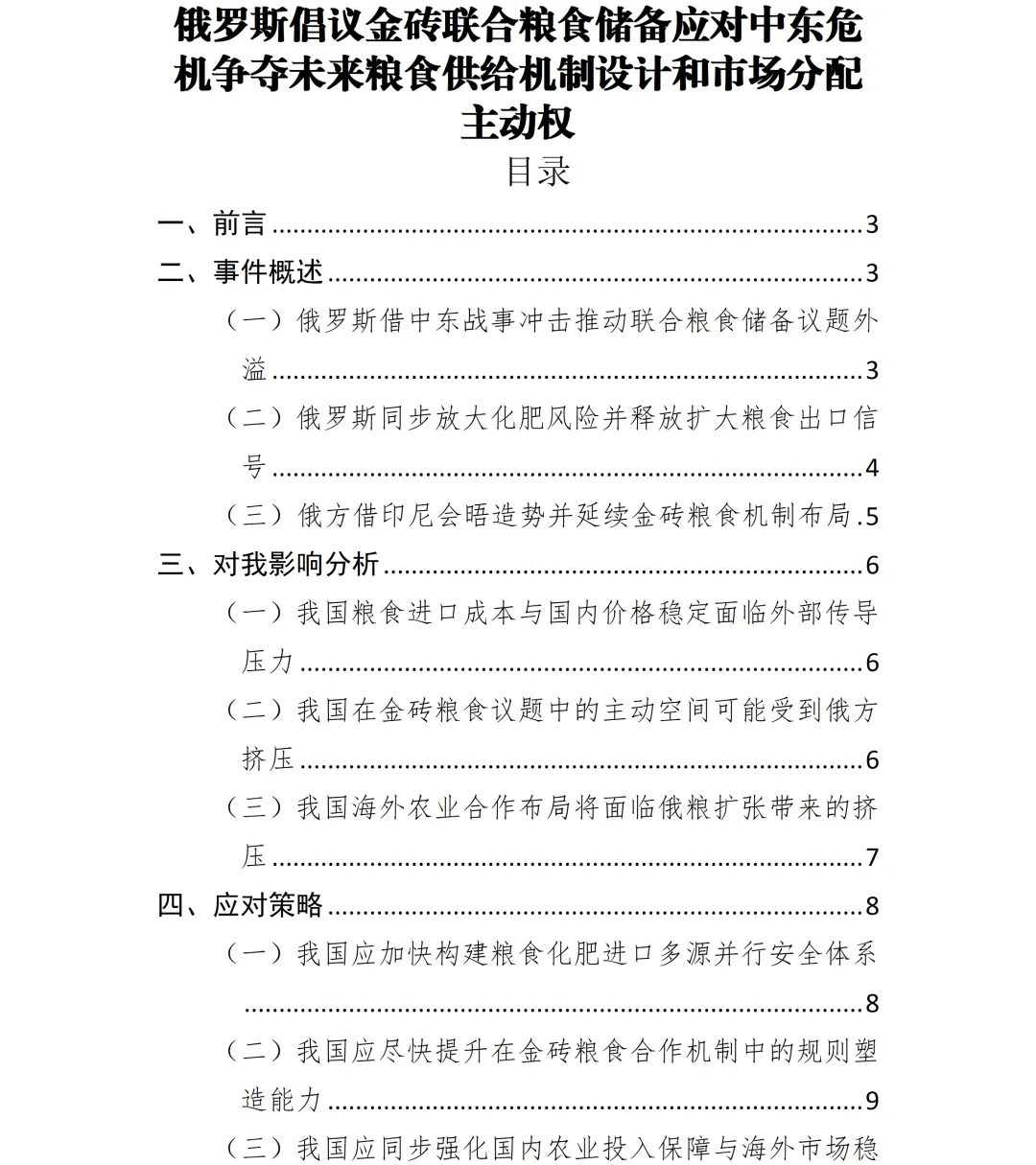 2026年4月13日,俄罗斯联邦安全会议副秘书亚历山大·马斯连尼科夫公开提出,应同金砖国家及欧亚经济联盟成员建立联合粮食储备,并将中东冲突、霍尔木兹海峡运输风险、化肥供应收缩和全球粮价波动相联系。