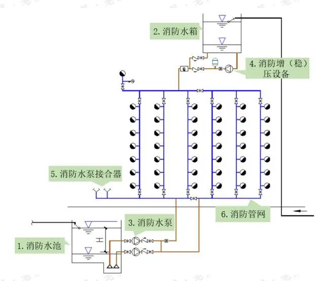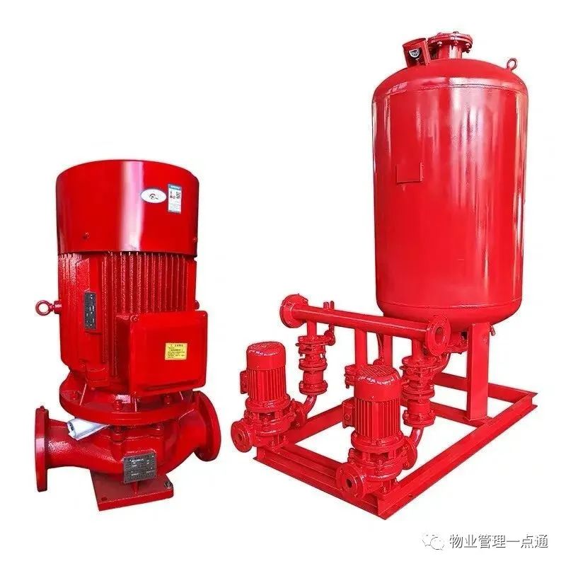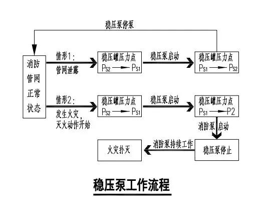 在消防给水系统中,湿式消火栓系统或者湿式自动灭火系统都是利用消防管道的静水压力变化来实现自动控制的。而要保证消防管道的基础静水压力,一般可以利用高位消防水箱与最不利压力处的高差来实现。而实际项目中,很难有足够的高差来设置高位消防水箱。这时,我们的主角——稳压泵,就隆重出场。它和气压罐配合,对消防管网进行压力调节工作,保证管道充满介质,并且具有一定的静水压力。如下图::稳压泵通过几个压力控制点与压力继电器相连接,实现自动控制功能。实际运行中,由于各种原因,稳压泵如果经常频繁启动,不但泵容易损坏,而且对整个管网系统不利,因此,稳压泵经常与小型气压罐配合使用。在气压罐内通常有P1,P2,PS1,PS2,四个压力控制点,P1为气压罐的最小工作压力,P2为水泵启动压力,PS1为稳压泵启动压力。