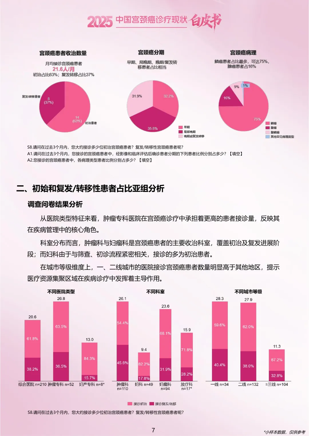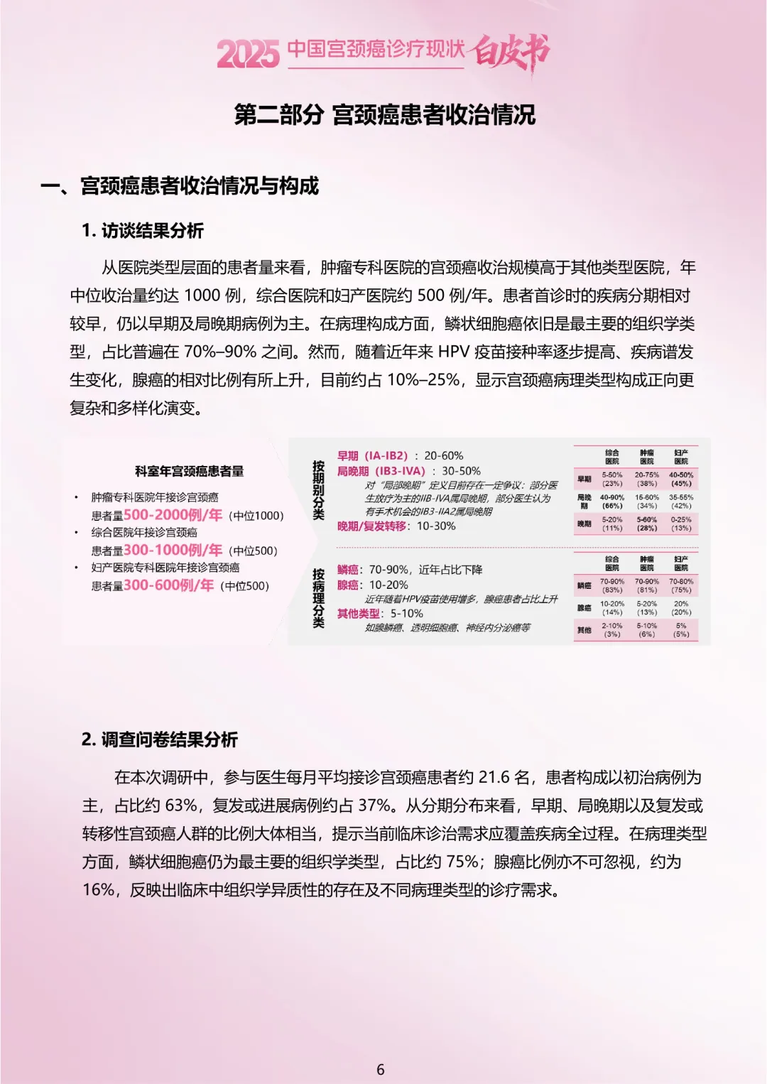 •患者构成:参与调研医生月均接诊21.6名宫颈癌患者,鳞癌占比75%,腺癌占比16%。肿瘤专科医院接诊的复发/转移患者比例更高。