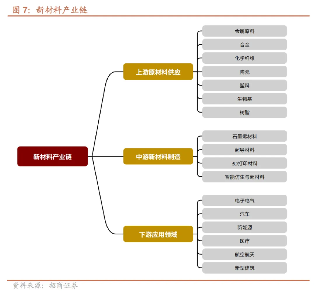我国新材料产业链主要由上游原材料供应、中游新材料制造和下游应用领域三个核心环节构成,各环节协同联动支撑产业运转。上游原材料供应环节涵盖金属原料、合金、化学纤维、陶瓷、塑料、生物基、树脂等,其质量与稳定性直接决定中游产品的品质和生产成本;中游新材料制造环节是产业链的核心,主要包括石墨烯材料、超导材料、3D 打印材料、智能仿生与超材料等产品的研发制造,通过技术创新和工艺优化,持续推出高性能新材料产品;下游应用领域十分广泛,涵盖电子电气、汽车、新能源、医疗、航天航空、新型建筑等多个行业,下游行业的快速发展为新材料产业提供了广阔的市场空间,也推动着新材料产品的迭代升级。
