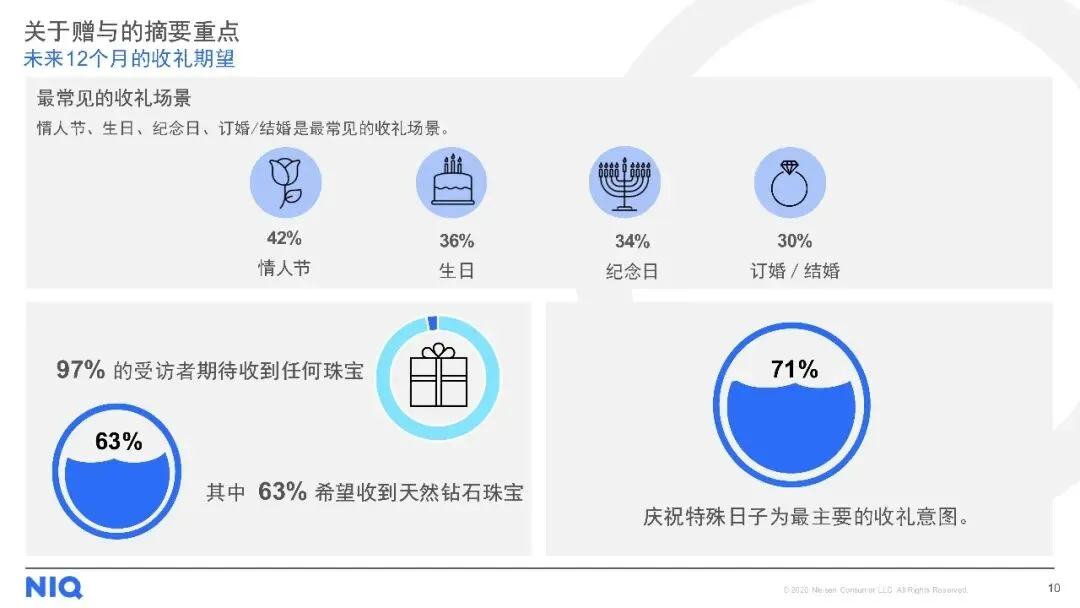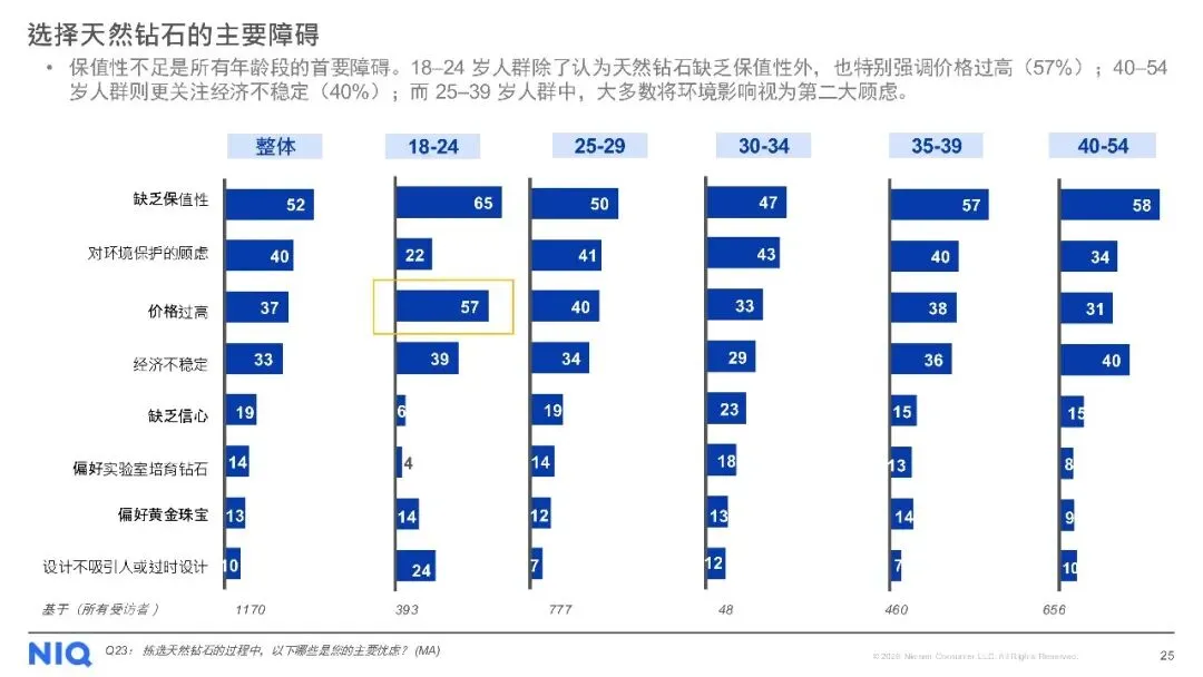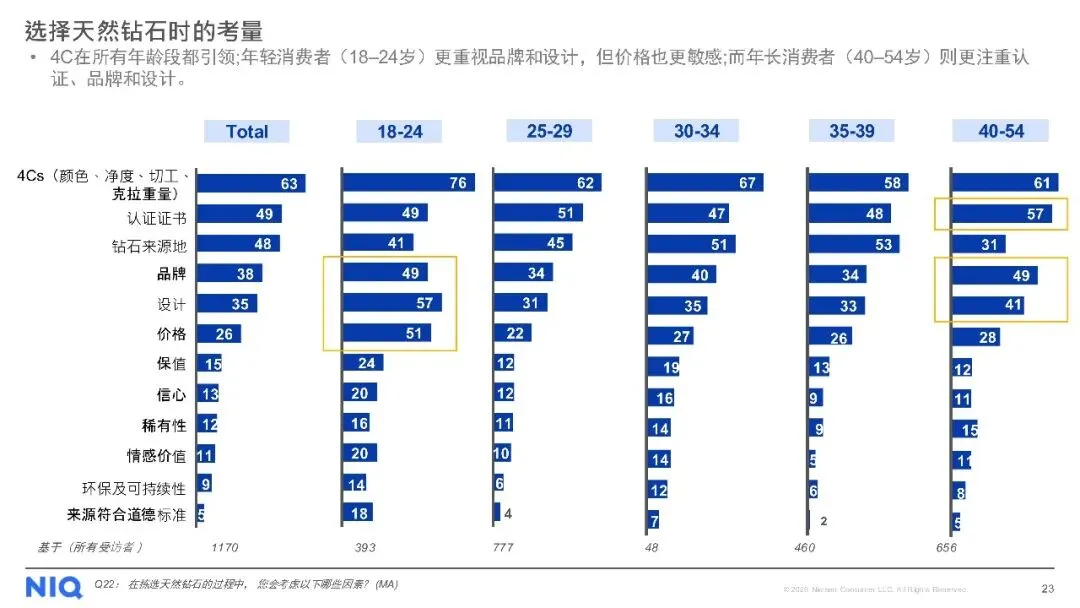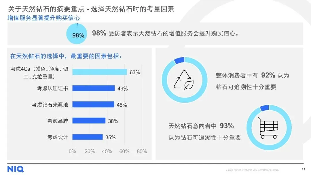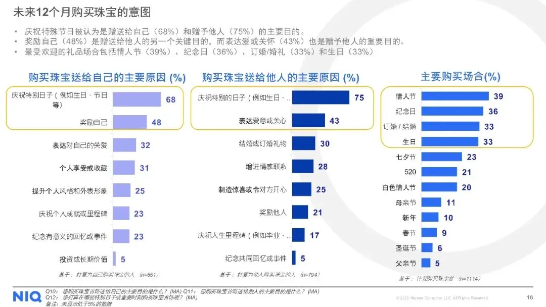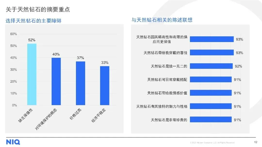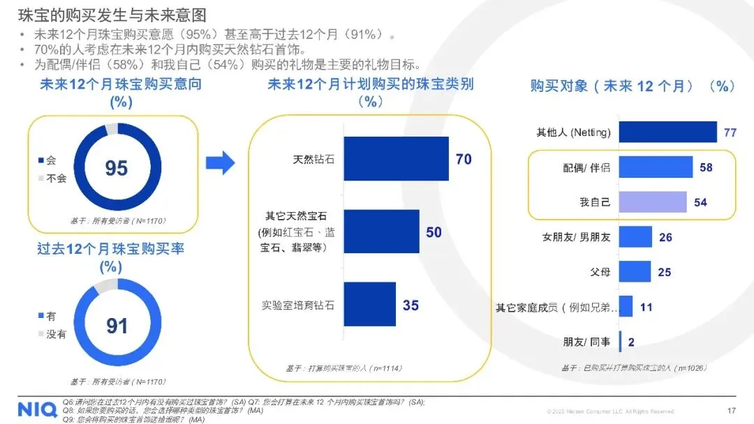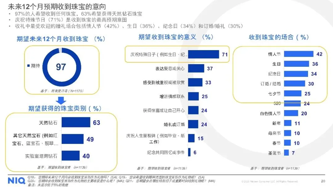 购买渠道方面,线下店铺仍是主流,但线上购买趋势上升。对于天然钻石,消费者最看重4C标准(颜色、净度、切工、克拉重量),同时钻石的可追溯性、认证证书及来源地也至关重要。尽管天然钻石被认为具有保值性、独特性和情感价值,但保值性不足和对环境的顾虑仍是主要购买障碍。此外,受访者普遍期待收到珠宝作为礼物,尤其是天然钻石珠宝,以庆祝特殊日子为主要收礼意图。