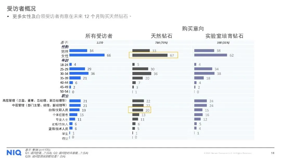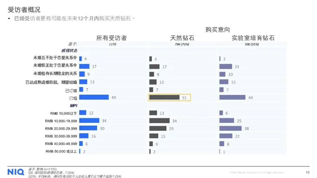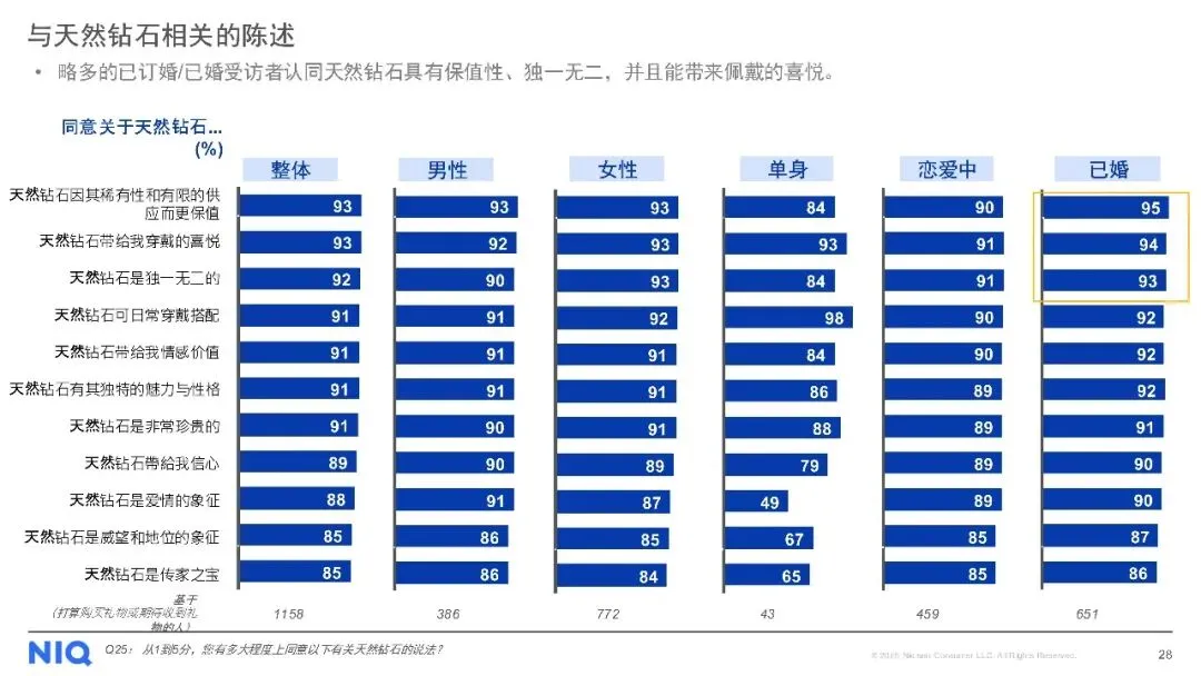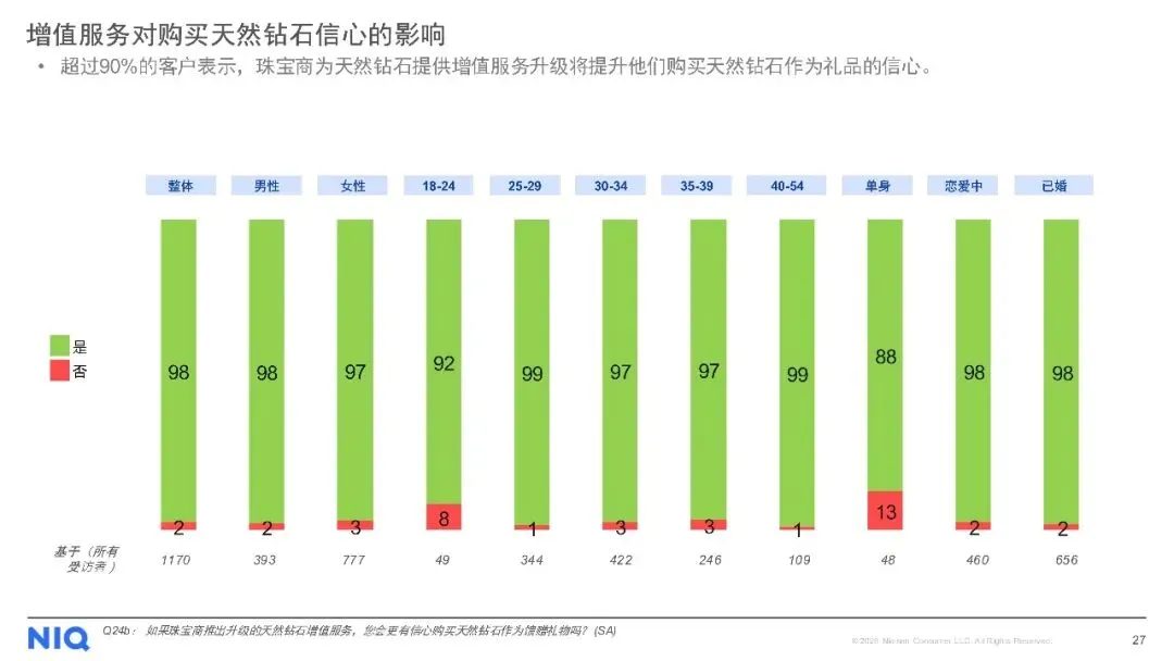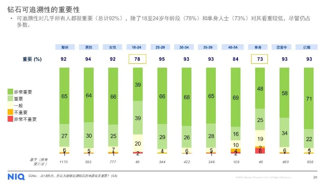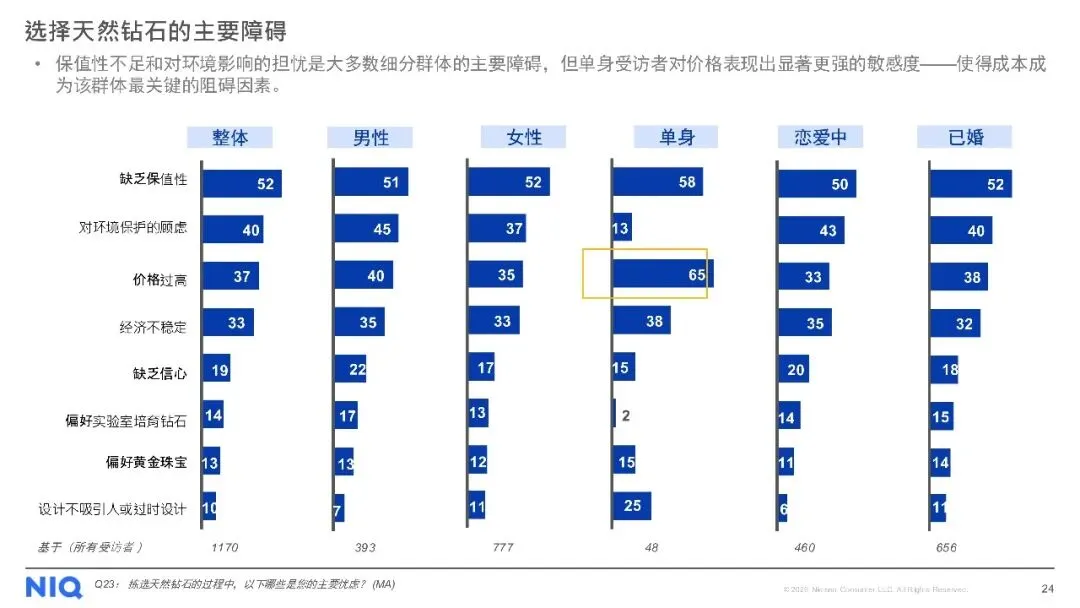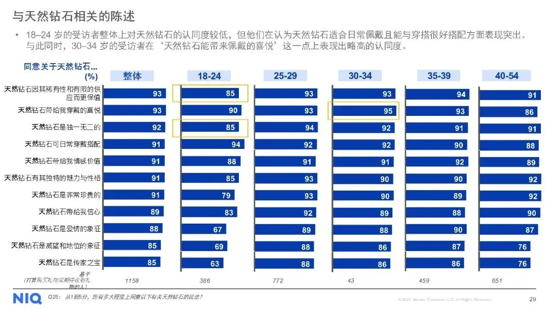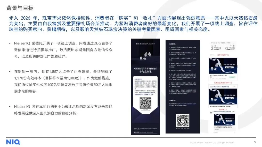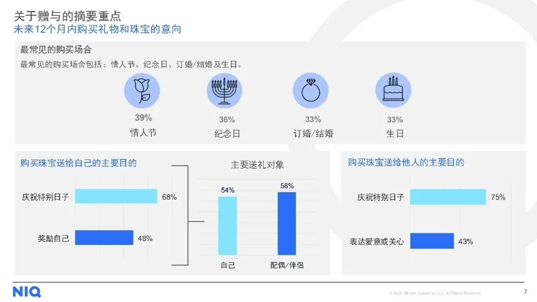 购买渠道方面,线下店铺仍是主流,但线上购买趋势上升。对于天然钻石,消费者最看重4C标准(颜色、净度、切工、克拉重量),同时钻石的可追溯性、认证证书及来源地也至关重要。尽管天然钻石被认为具有保值性、独特性和情感价值,但保值性不足和对环境的顾虑仍是主要购买障碍。此外,受访者普遍期待收到珠宝作为礼物,尤其是天然钻石珠宝,以庆祝特殊日子为主要收礼意图。