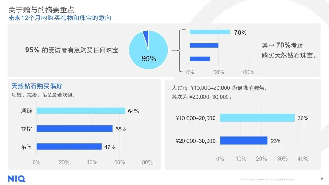 95%的受访者有未来一年内购买珠宝的意向,主要购买场合包括情人节、纪念日及生日等,其中天然钻石最受欢迎,70%的消费者考虑购买。消费偏好上,项链、戒指和吊坠是首选,价格区间集中在人民币10,000至30,000元,中型钻石(1-1.49克拉)最受欢迎,且多数消费者偏好多颗钻石镶嵌设计。