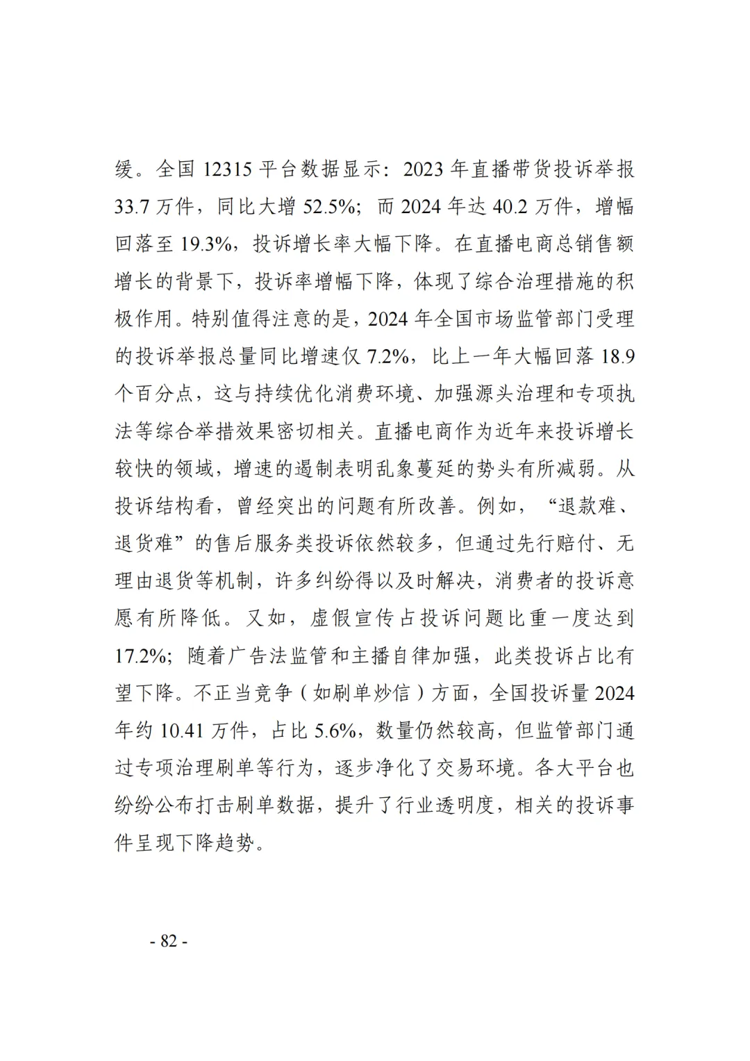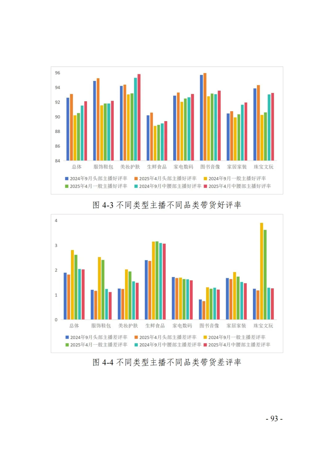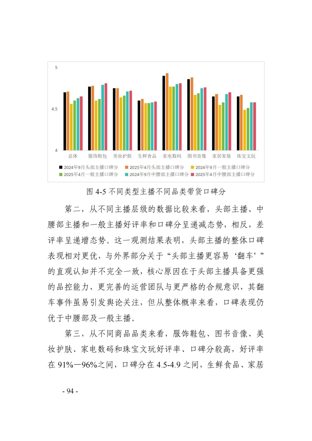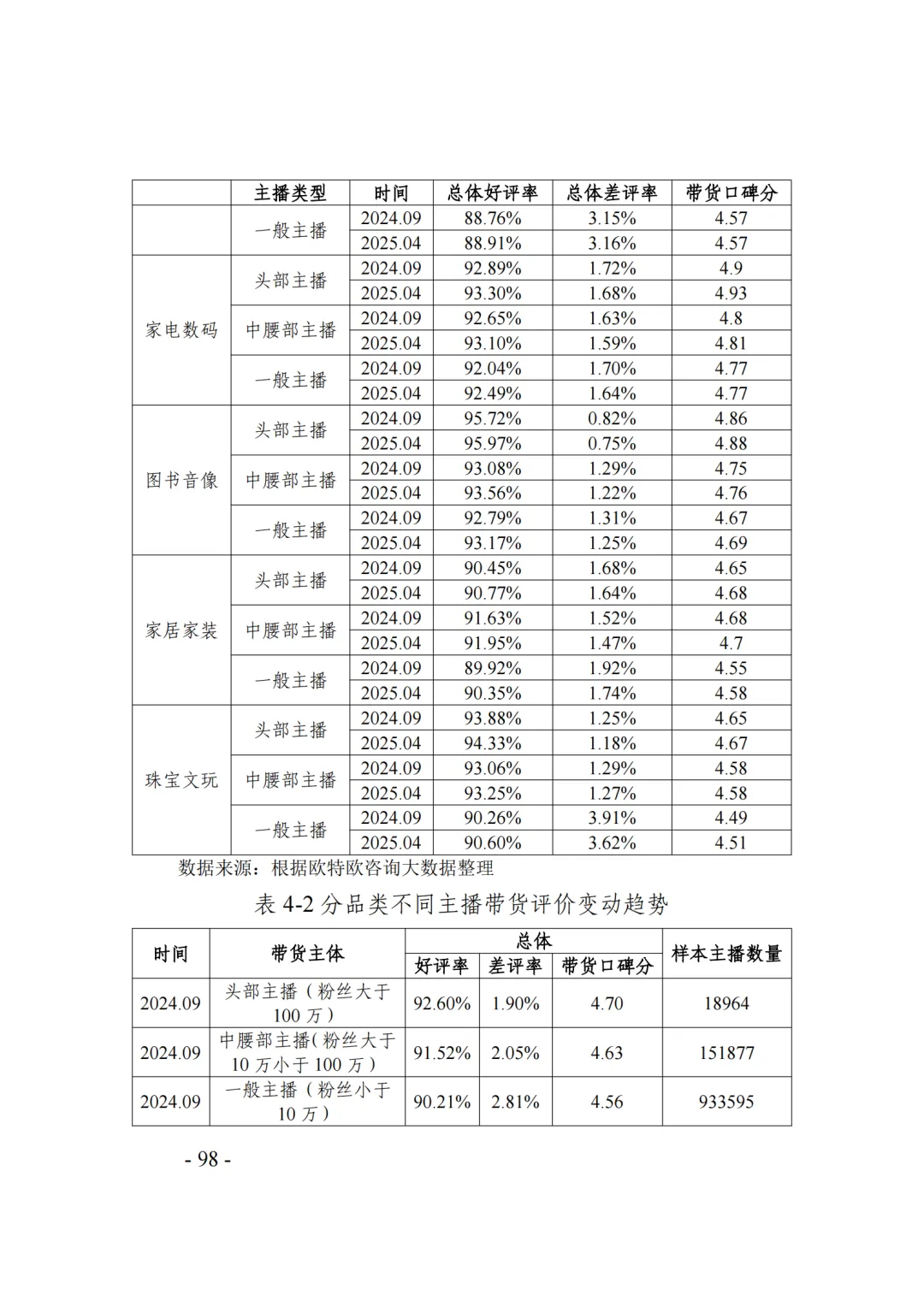 同时行业仍面临挑战:内容创新需平衡流量与合规,供应链品控因主体多元更趋复杂,复合型主播稀缺制约专业升级。经过多方治理,2024 年消费投诉增幅收窄至 19.3%,头部与中小主播好评率均超 90%,商品质量与消费信心稳步提升。