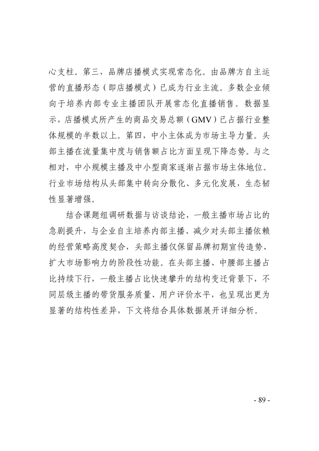 行业发展呈现四大特征:治理体系向 “政府监管 + 平台治理 + 行业自律 + 舆论监督” 协同化演进;网络主播成为国家新职业,职业化进程加速;品牌店播常态化,GMV 占比超半数;中小主体崛起,2025 年中小主播 GMV 占比达 89.34%,市场结构趋向多元。数智技术深度融合,虚拟主播、AI 选品等应用提升行业效率,推动 “产业带 + 直播” 等新模式落地。