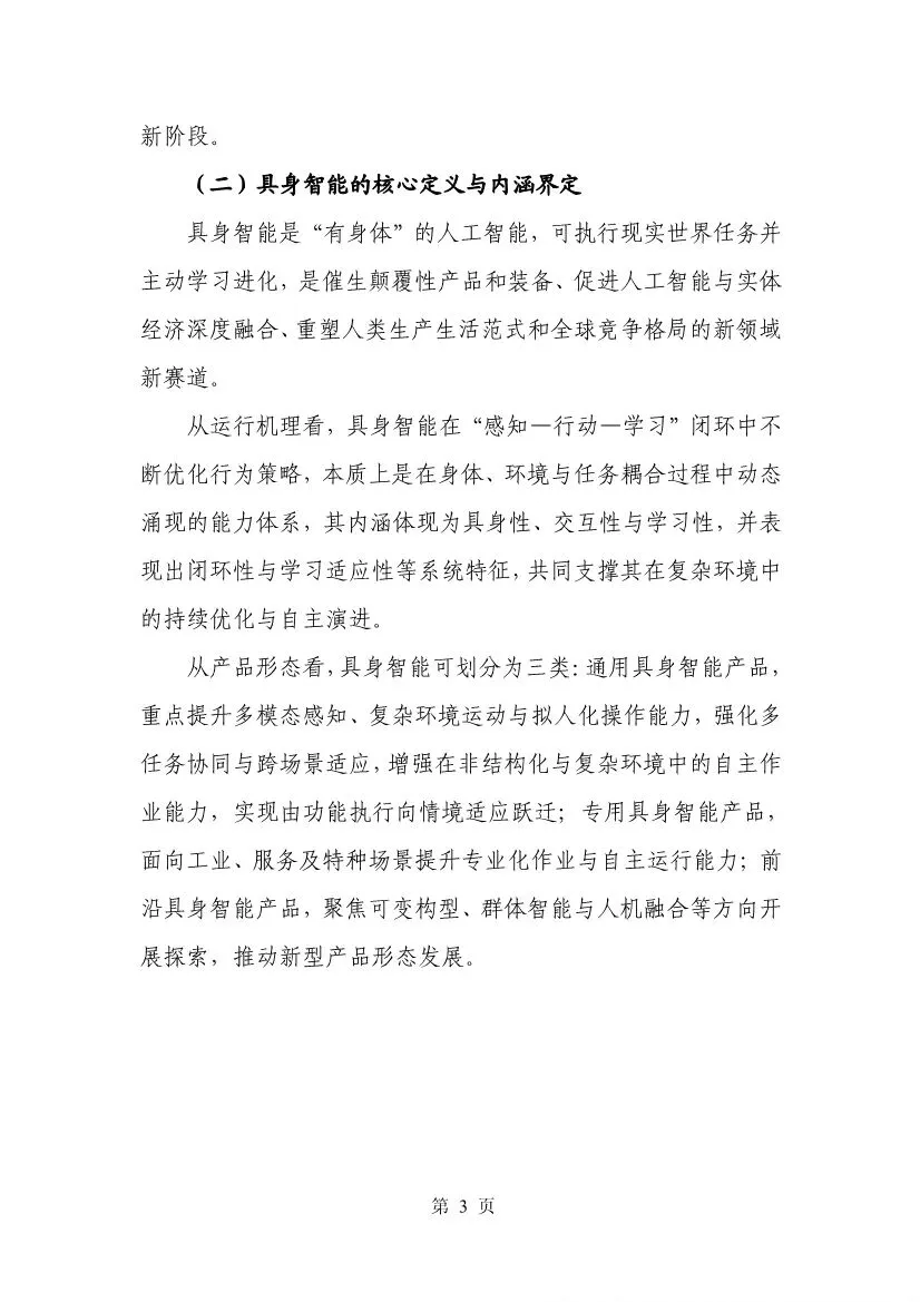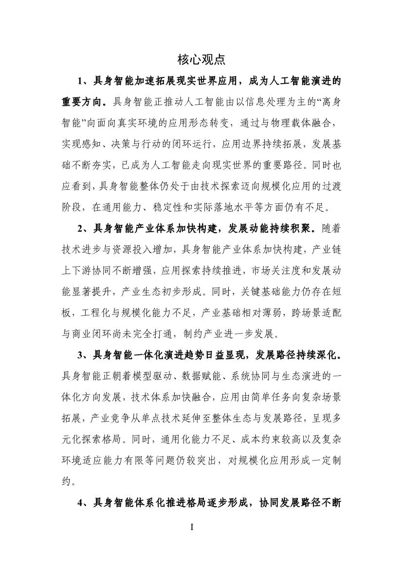 报告开宗明义,指出具身智能是“有身体”的人工智能。它通过在“感知-决策-执行-学习”的动态闭环中,与环境持续交互、不断优化,从而“涌现”出智能。其核心特征在于具身性、交互性与学习性。