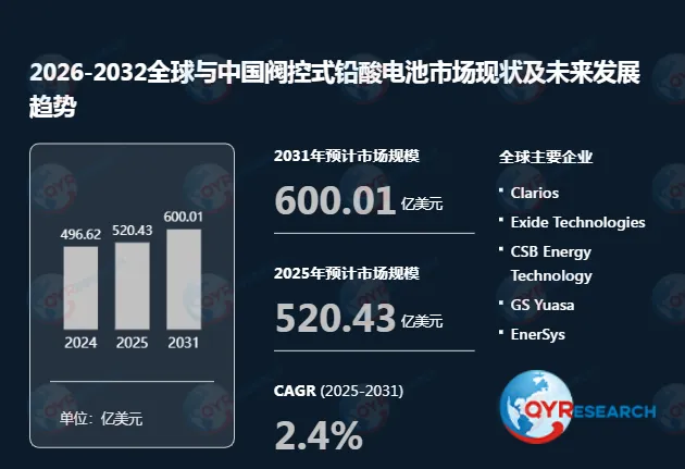 根据QYR(恒州博智)的统计及预测,2025年全球阀控式铅酸电池市场销售额达到了520.4亿美元,预计2031年将达到600.01亿美元,年复合增长率(CAGR)为2.4%(2025-2031)。