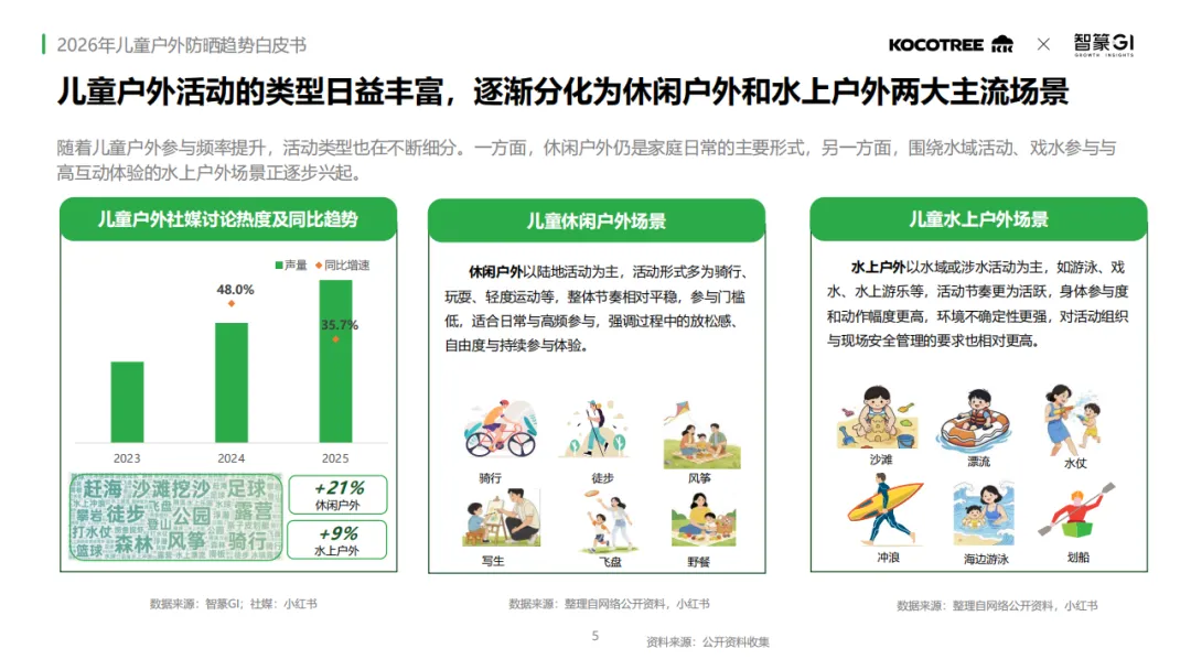 随着户外活动类型的丰富,单一的防晒产品已无法满足需求。报告将儿童户外场景精准划分为水上户外与休闲户外,两者的功能诉求呈现出截然不同的分化。