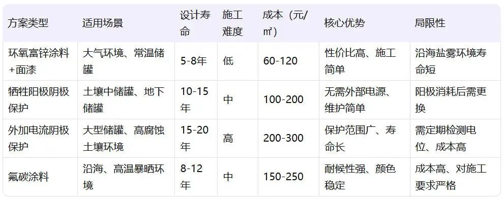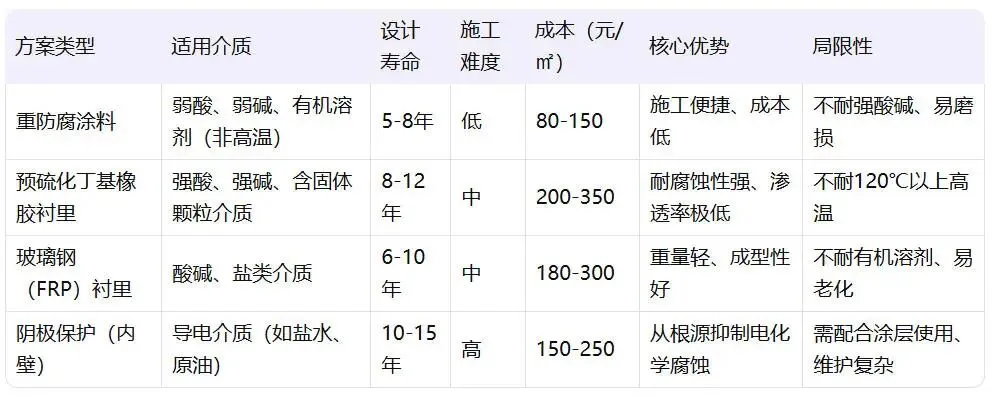 根据工况分析结果,从主流方案中初选2-3种候选方案,对比其耐腐蚀性、寿命、施工周期、维护难度,例如: