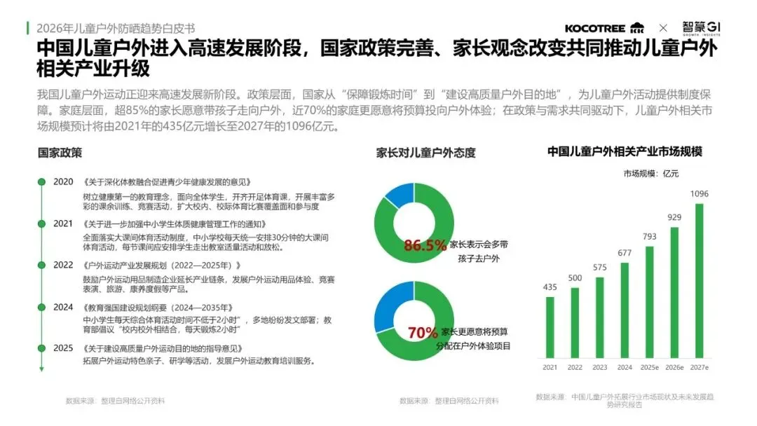 中国儿童户外运动进入高速发展阶段。政策层面,国家从“保障锻炼时间”到“建设高质量户外目的地”提供了制度保障。家庭层面,超过85%的家长愿意带孩子走向户外,近70%的家庭增加户外体验预算。在政策与需求共同驱动下,中国儿童户外相关市场规模预计将从2021年的435亿元增长至2027年的1096亿元。