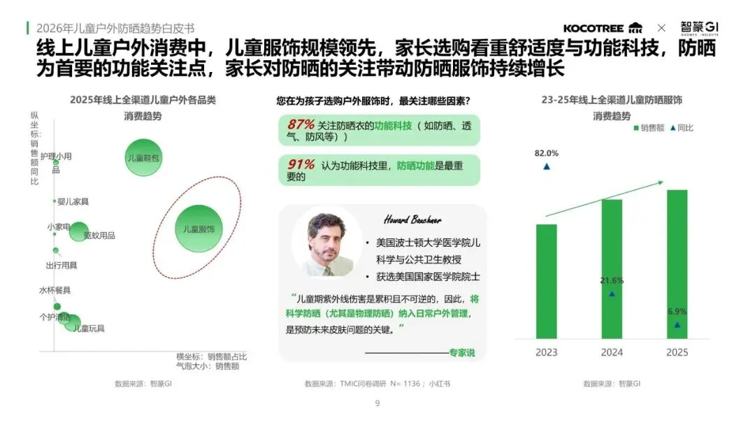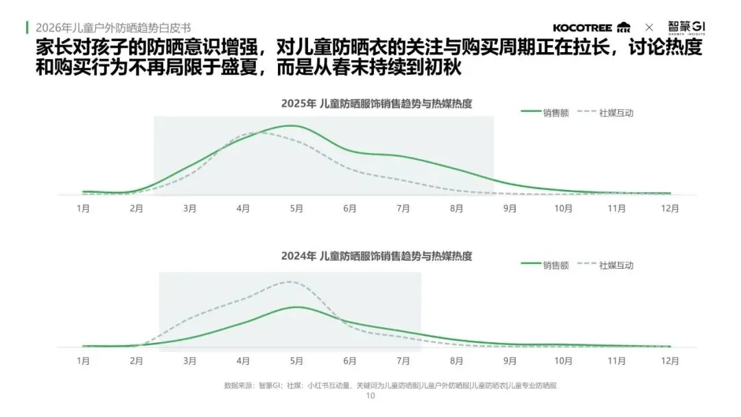 线上儿童户外消费市场中,儿童服饰规模领先。家长选购时最看重舒适度与功能科技,其中防晒是最受关注的功能点。防晒功能的关注度带动了儿童防晒服饰市场的持续增长。家长对防晒的关注与购买周期不断拉长,讨论热度和购买行为从春末持续到初秋。