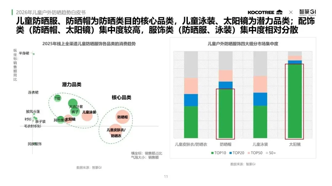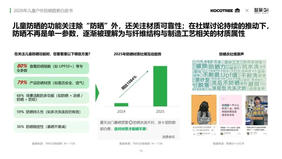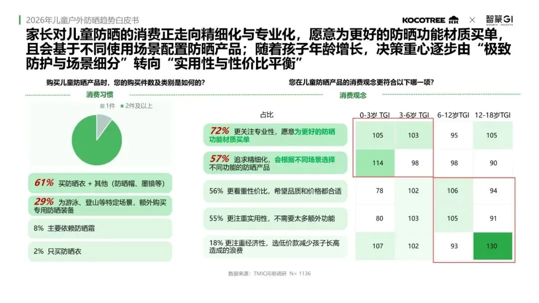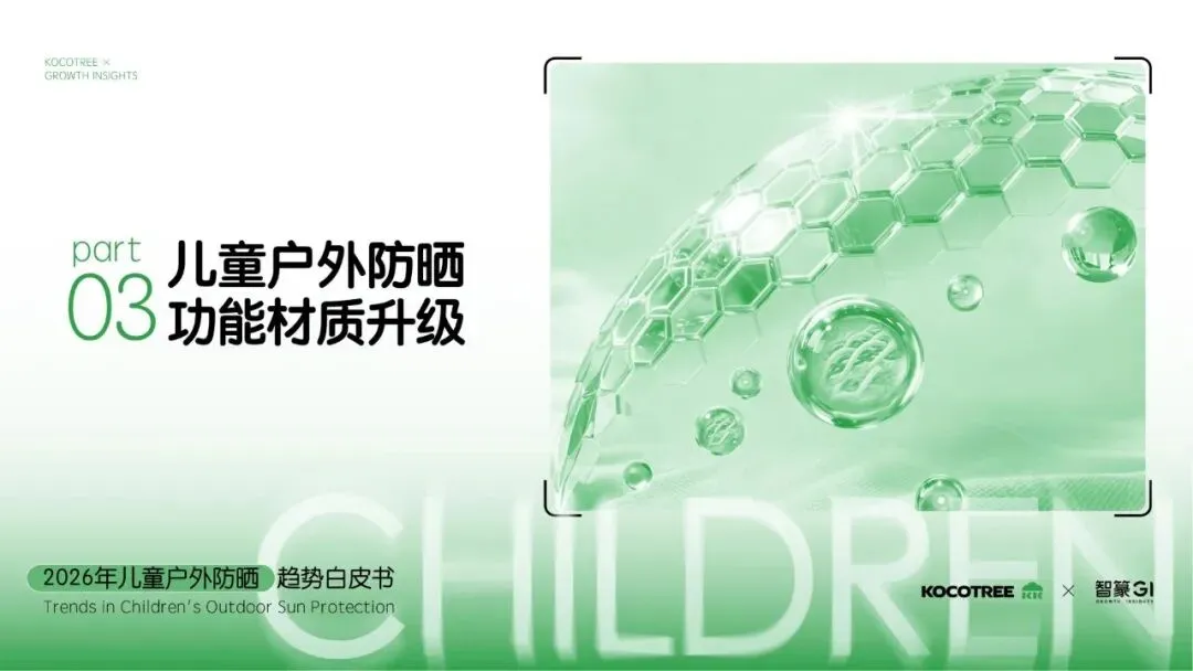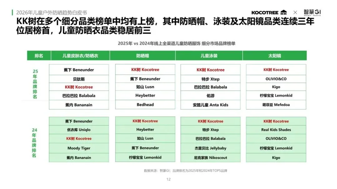 品牌竞争方面,KK树在防晒帽、泳装及太阳镜品类连续三年位居榜首,在儿童防晒衣品类中稳居前三。家长对儿童防晒的消费正走向精细化与专业化,愿意为更好的防晒功能材质买单,并会基于不同使用场景配置防晒产品。随着孩子年龄增长,决策重心逐步从“极致防护与场景细分”转向“实用性与性价比平衡”。