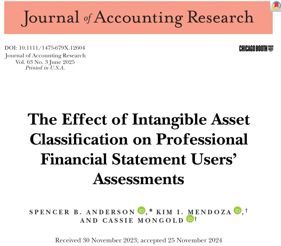 文献来源:Anderson, S. B., Mendoza, K. I., & Mongold, C. (2025). The Effect of Intangible Asset Classification on Professional Financial Statement Users’ Assessments. Journal of Accounting Research, 63(3), 1107-1143.