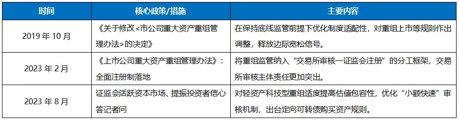 2019-2023年并购重组监管呈现“底线不变、逆周期适度松绑、向注册制框架适配”的特征,核心是在保持监管底线的前提下,优化制度适配性,提升并购重组服务实体经济的能力。