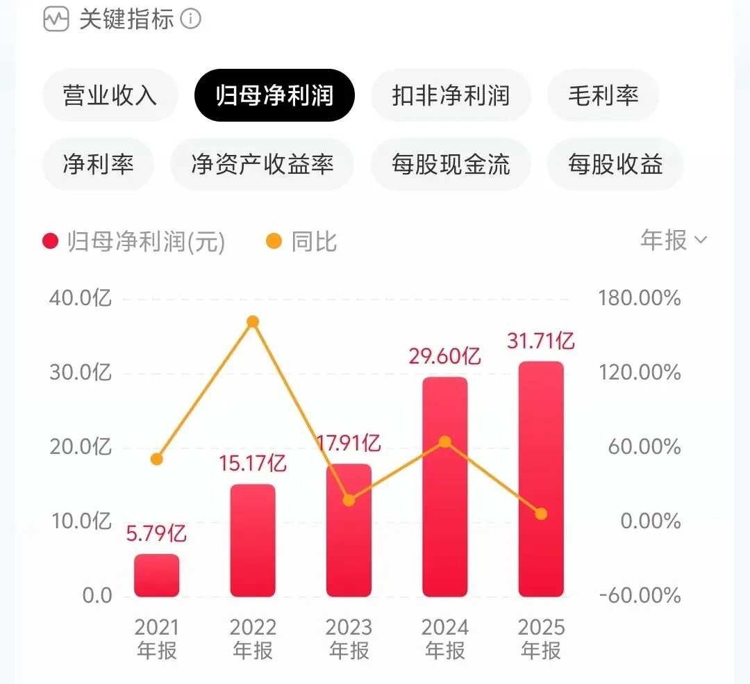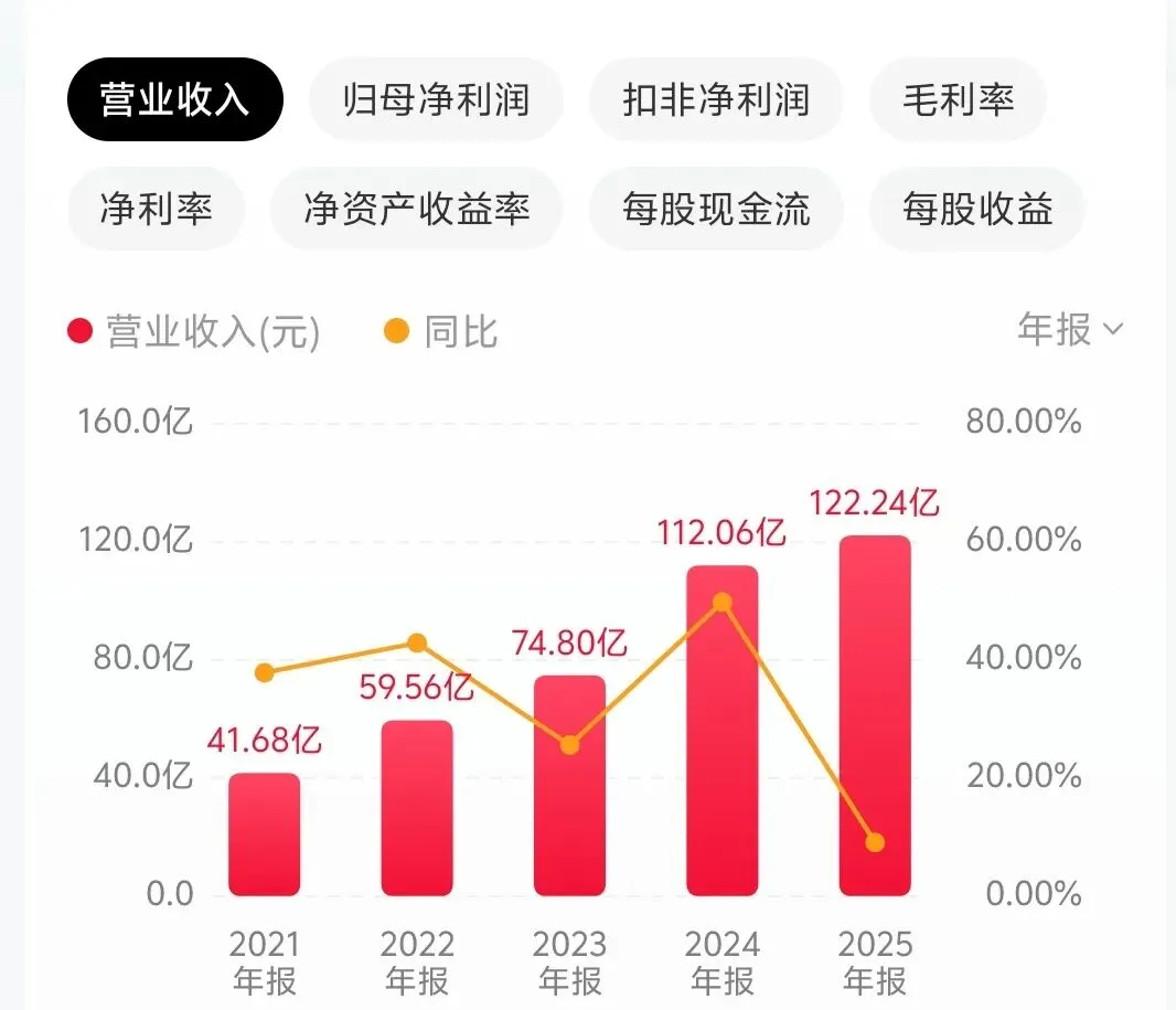 公司近五年营业收入从上市时的41亿元涨到了2025年的122亿元,五年涨了3倍左右,营收增长很稳定。