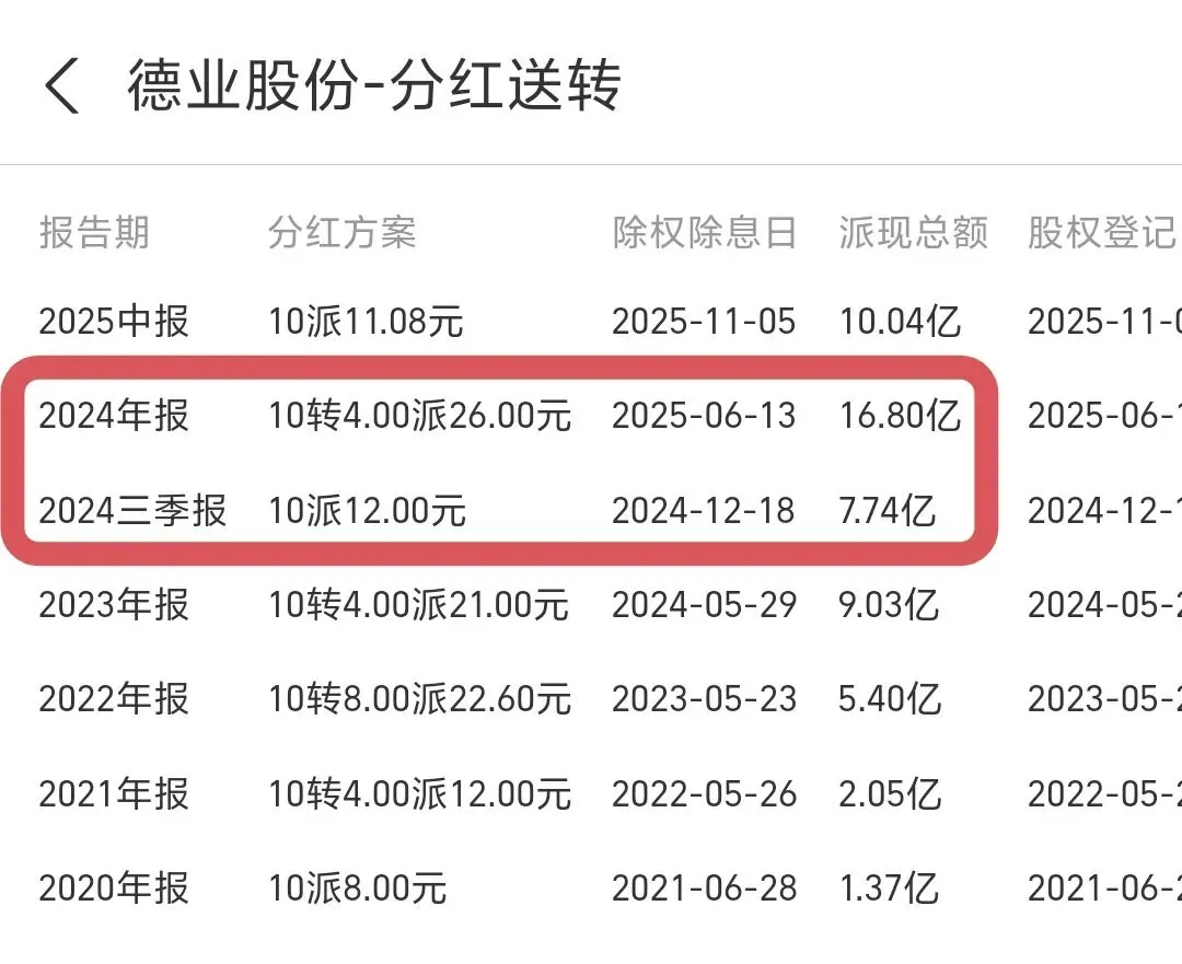 去年看中德业股份,除了业绩利润超级优秀外,公司分红也特别够意思,2024年公司一年两次分红合计10派38元,当时分享的时候股价55元左右股息率6.8%左右,有业绩利润支撑再加上6.8%的分红股息率,安全垫足够厚实。