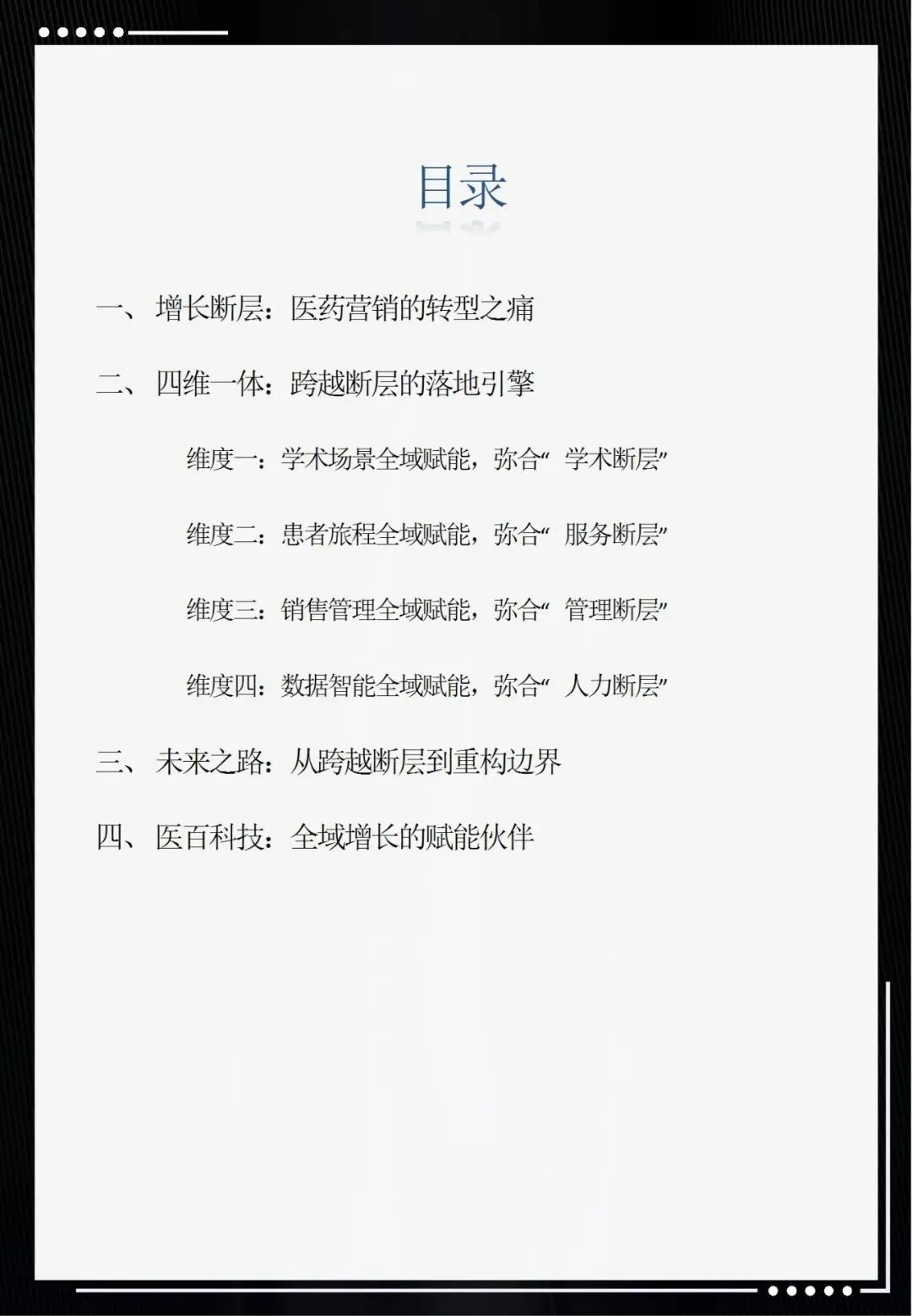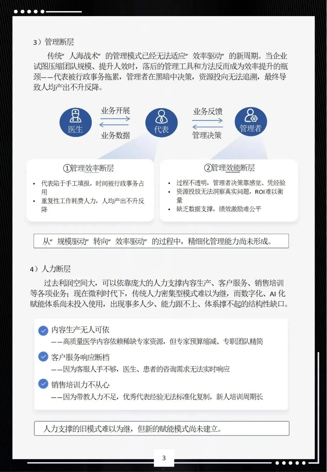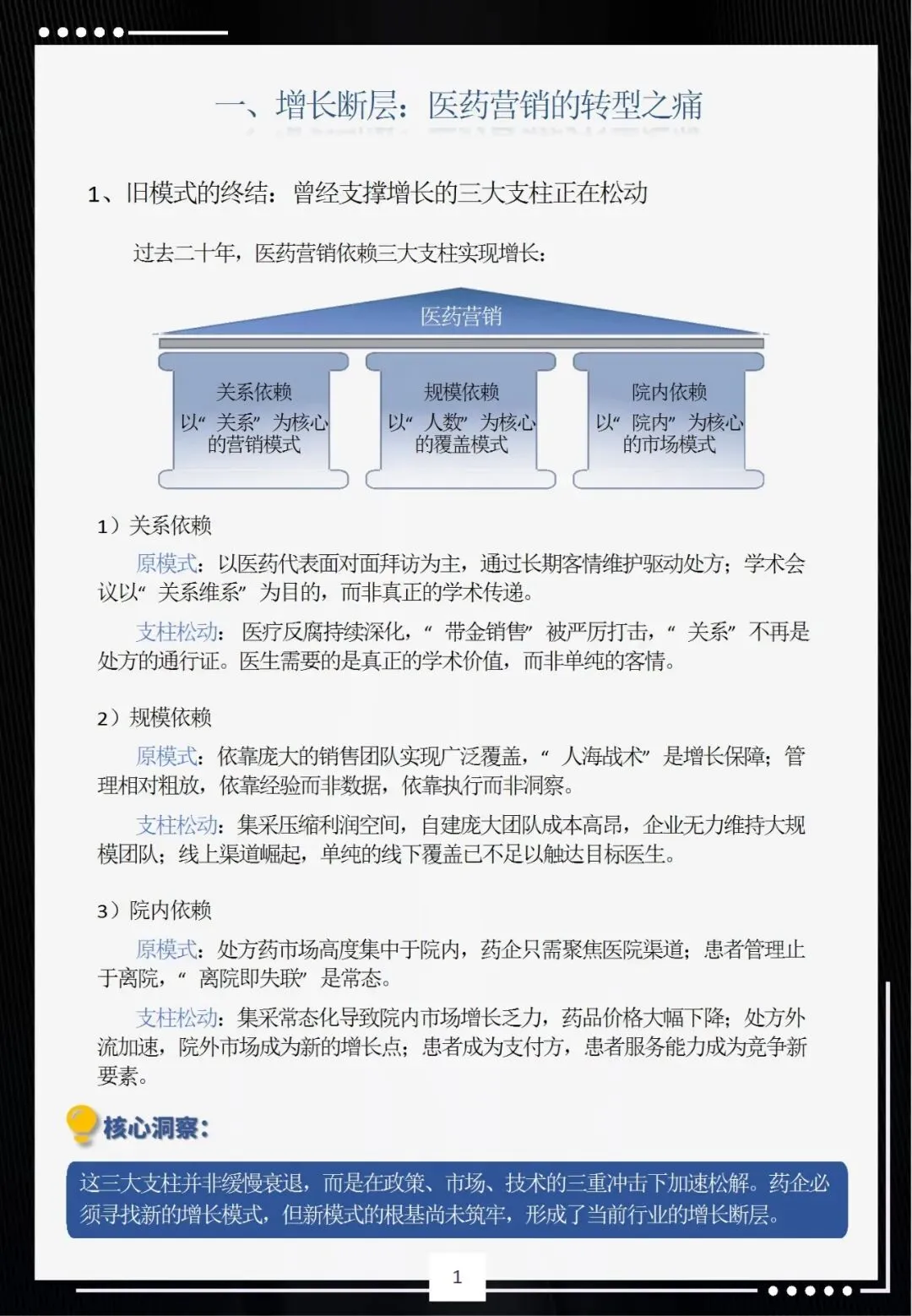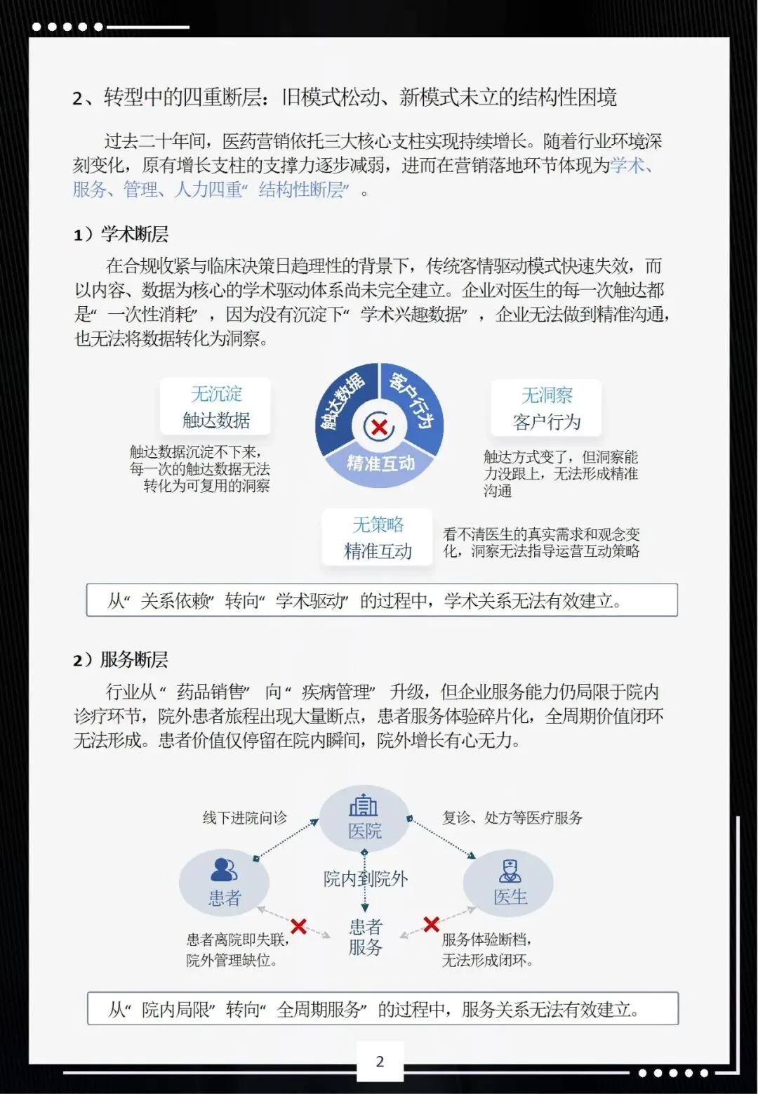 在政策、市场与技术的多重驱动下,我国医药营销传统增长模式加速变革,以关系依赖、规模依赖、院内依赖为核心的旧有支柱持续松动,行业进入深度转型期。当前医药数字化营销面临学术、服务、管理、人力四重结构性断层,传统点状工具难以系统性解决深层问题,全域融合成为行业破局关键。 为推动医药营销从单点工具应用迈向系统化能力建设,从断层割裂走向全域协同,本报告围绕转型痛点与发展路径展开分析,提出四维一体全域赋能框架,分别从学术场景、患者旅程、销售管理、数据智能四大维度构建闭环能力,助力行业弥合转型断层、重构增长边界。同时报告展望行业未来三大发展趋势,明确从工具到系统、从人力到智能、从断层到融合的升级方向,为医药企业数智化转型提供清晰参考。