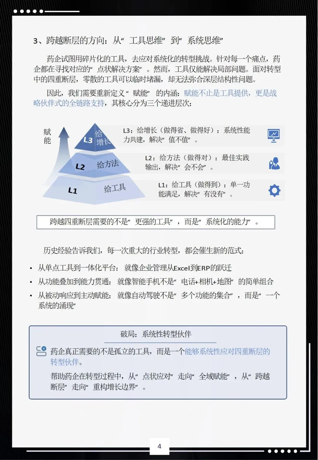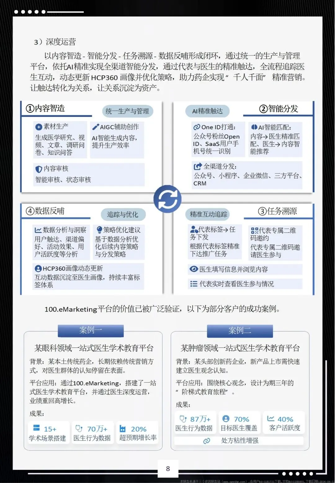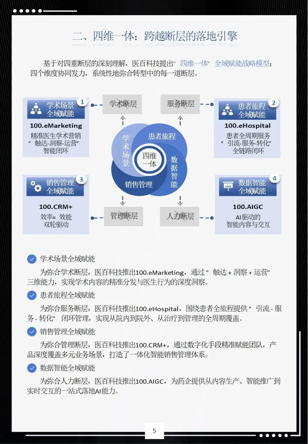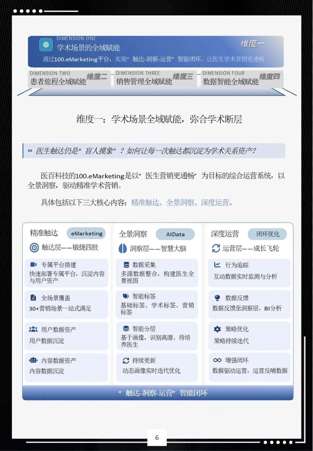 在政策、市场与技术的多重驱动下,我国医药营销传统增长模式加速变革,以关系依赖、规模依赖、院内依赖为核心的旧有支柱持续松动,行业进入深度转型期。当前医药数字化营销面临学术、服务、管理、人力四重结构性断层,传统点状工具难以系统性解决深层问题,全域融合成为行业破局关键。 为推动医药营销从单点工具应用迈向系统化能力建设,从断层割裂走向全域协同,本报告围绕转型痛点与发展路径展开分析,提出四维一体全域赋能框架,分别从学术场景、患者旅程、销售管理、数据智能四大维度构建闭环能力,助力行业弥合转型断层、重构增长边界。同时报告展望行业未来三大发展趋势,明确从工具到系统、从人力到智能、从断层到融合的升级方向,为医药企业数智化转型提供清晰参考。