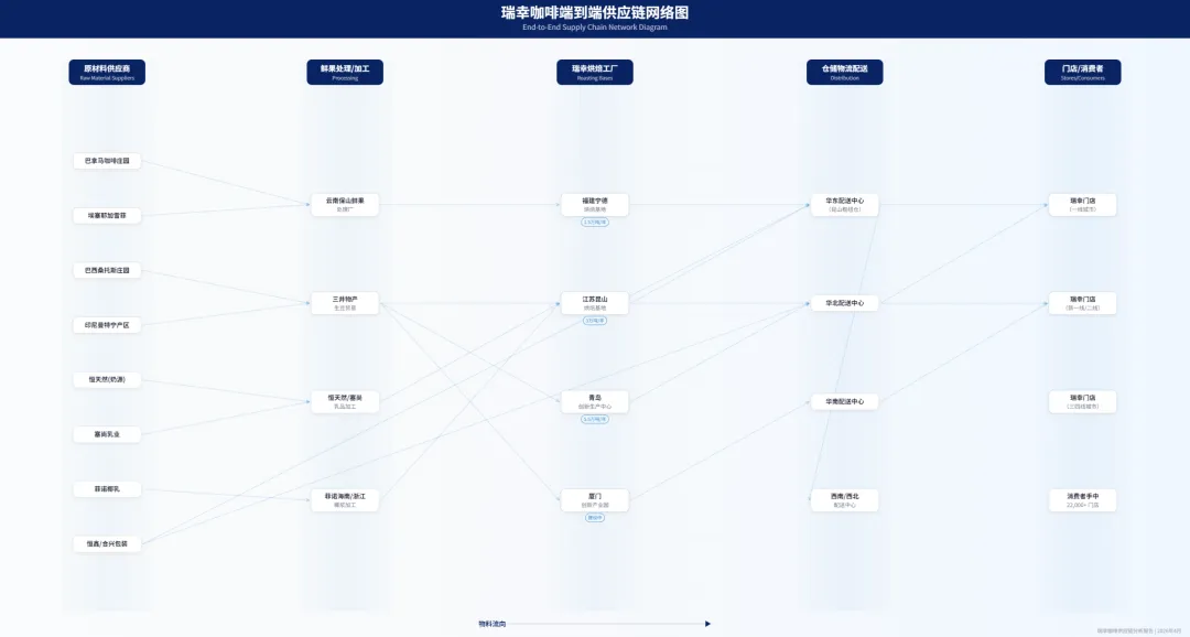 下图展示了瑞幸咖啡从"原材料供应商 → 烘焙加工 → 仓储配送 → 门店制作 → 消费者手中"的端到端完整供应链网络。