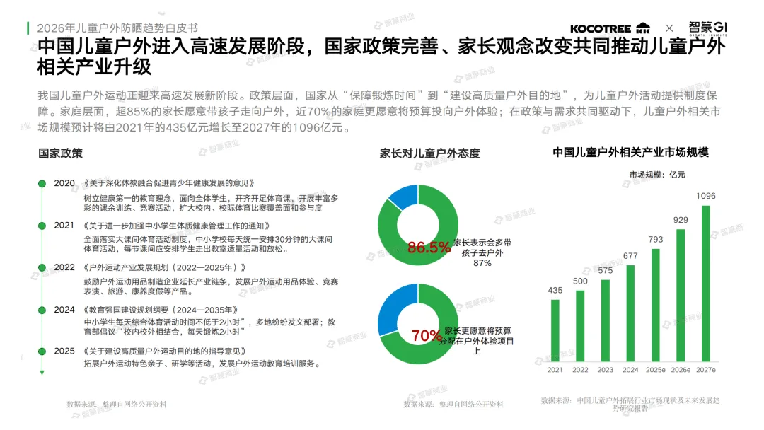 2026 年中国儿童户外产业进入高速发展期,政策支持与家长观念转变双轮驱动,儿童户外防晒市场呈现专业化、场景化、精细化升级趋势,原纱防晒成为核心技术方向,场景需求分化明显,品牌格局逐步清晰。