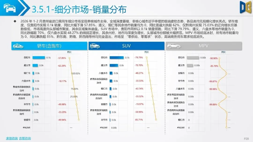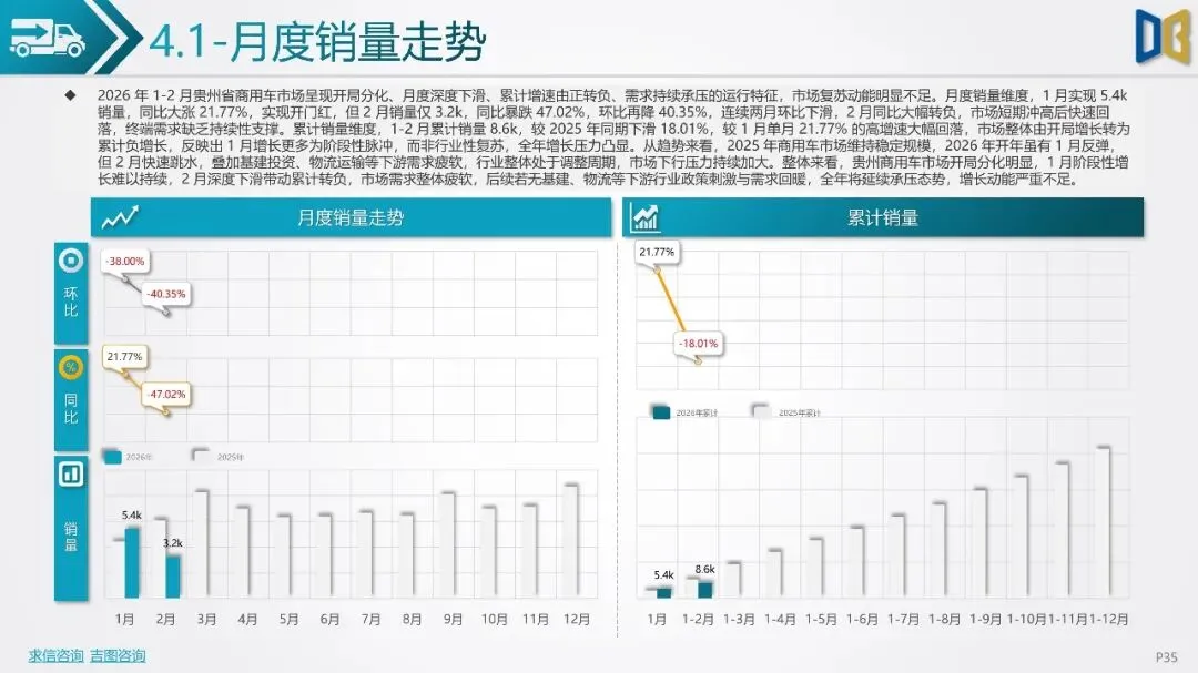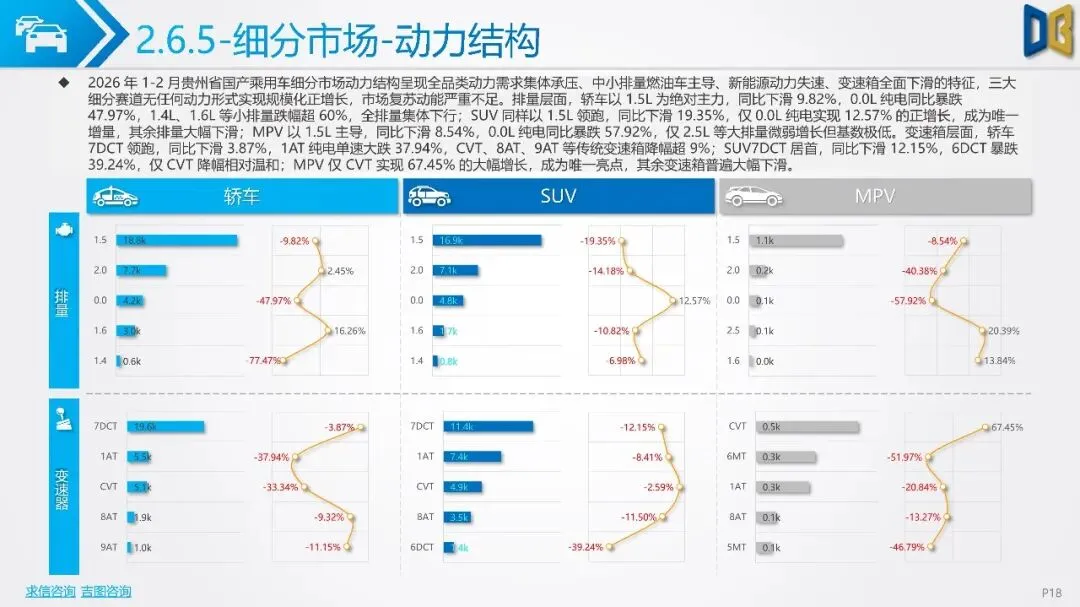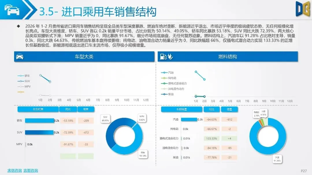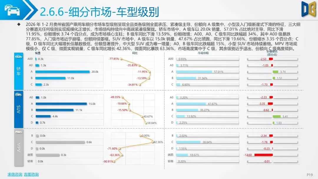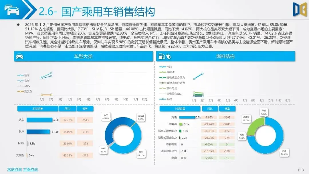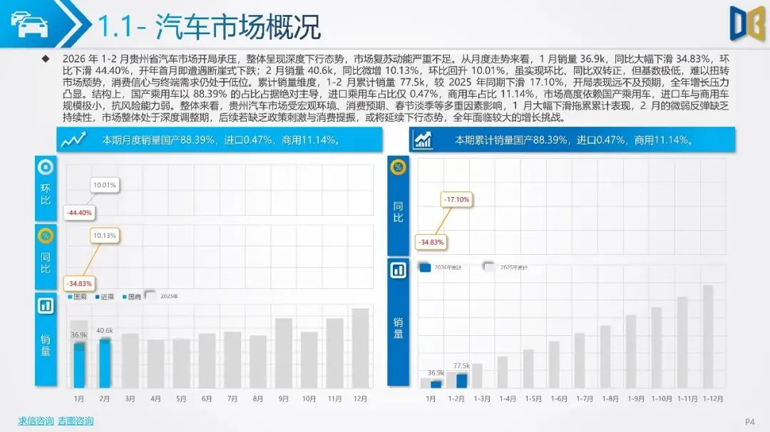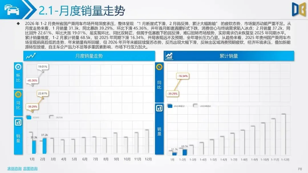 贵州省汽车市场开局承压,整体呈现深度下行态势,消费信心与终端需求不足。国产乘用车占据市场主导,但销量同比大幅下滑,新能源车型失速,传统燃油车基本盘萎缩。进口乘用车市场更是断崖式下滑,高端消费信心严重不足。商用车市场同样面临压力,月度销量冲高后大幅回落,需求在春节后快速萎缩。