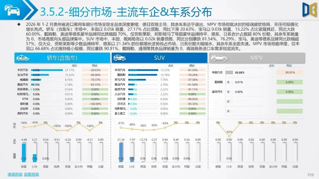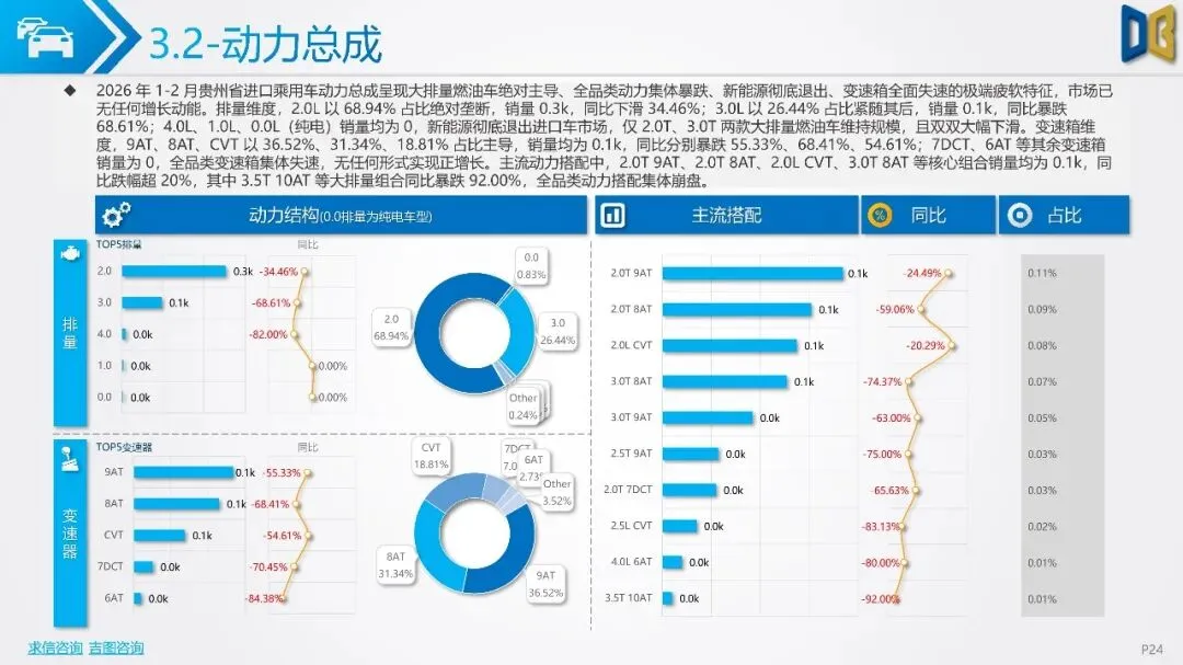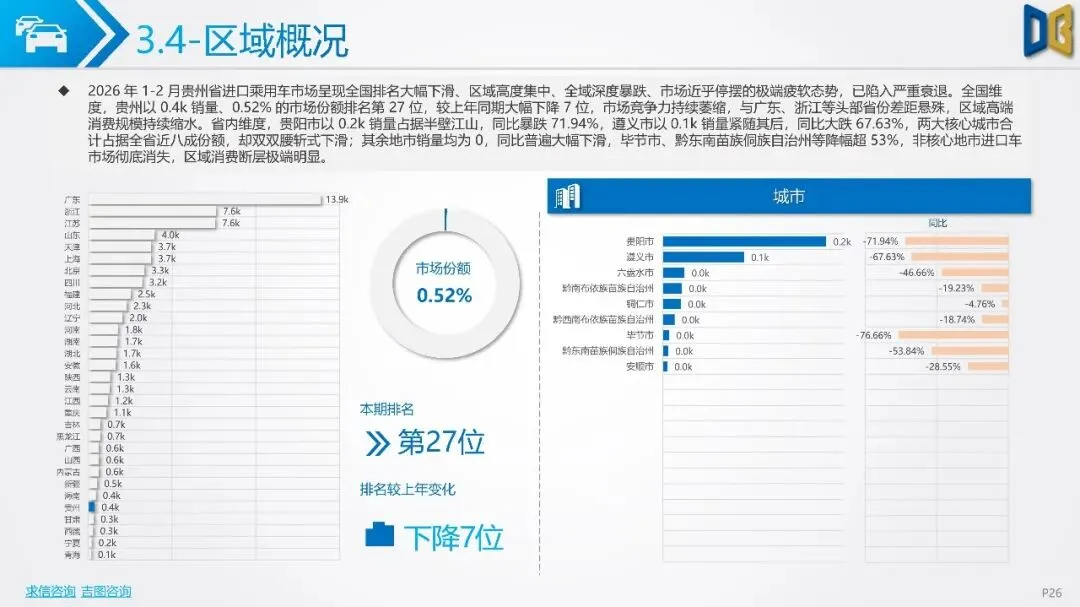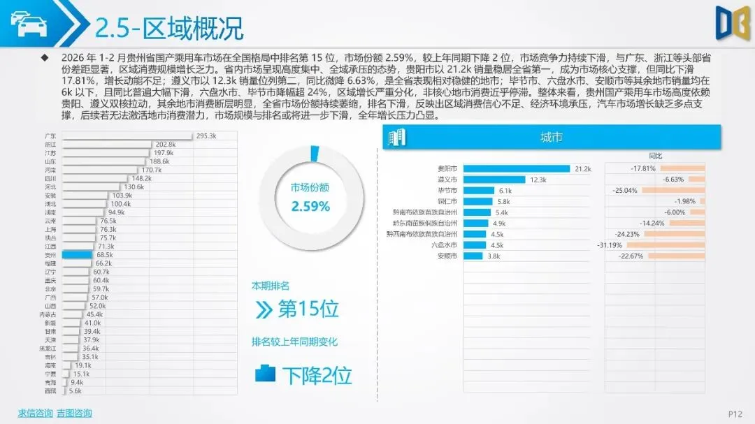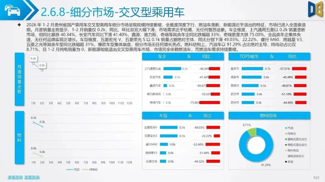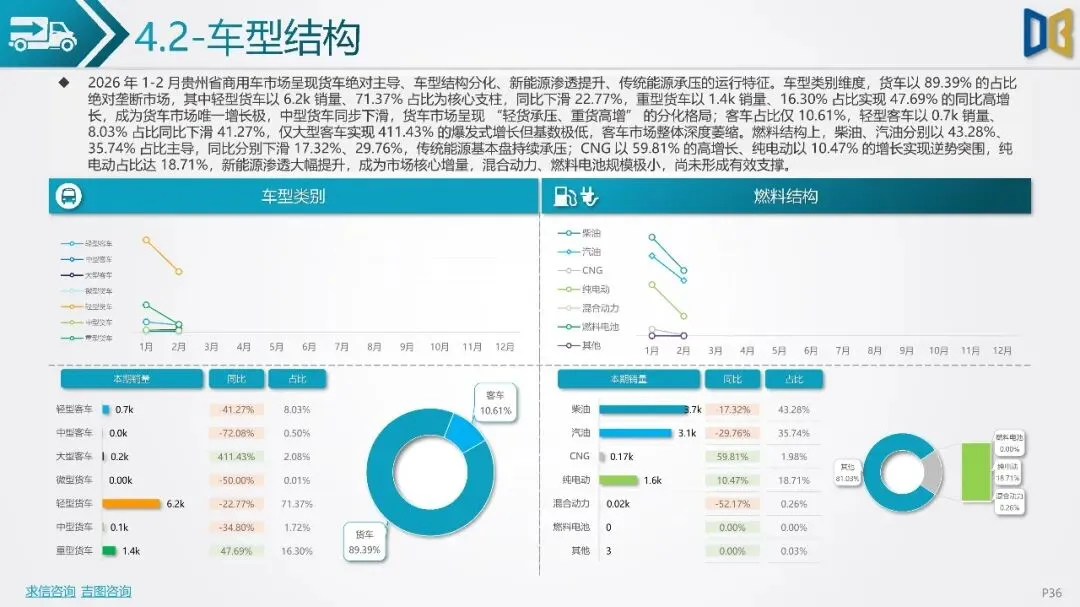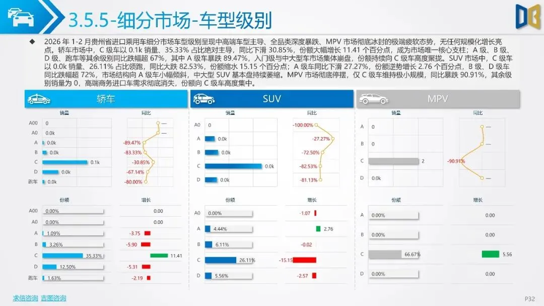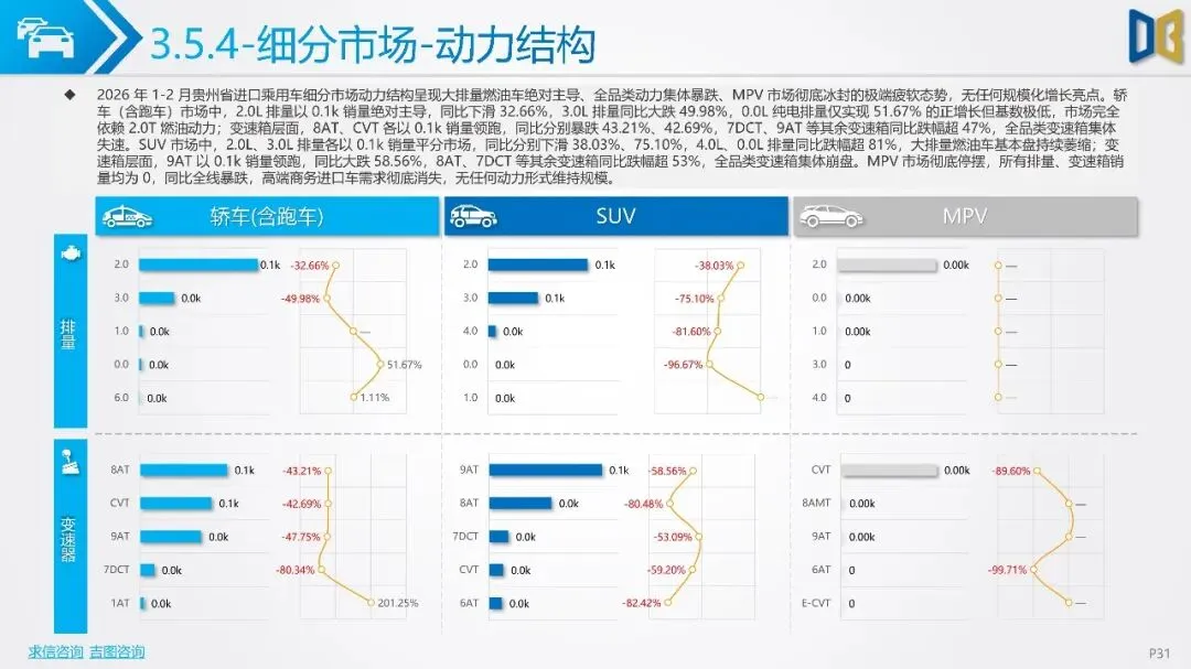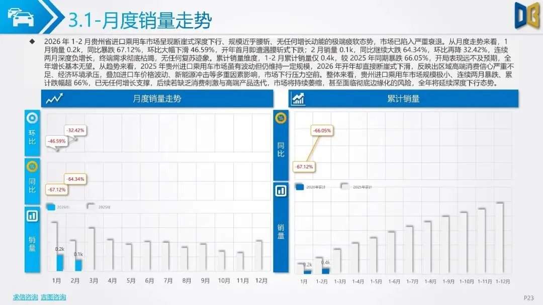 贵州省汽车市场开局承压,整体呈现深度下行态势,消费信心与终端需求不足。国产乘用车占据市场主导,但销量同比大幅下滑,新能源车型失速,传统燃油车基本盘萎缩。进口乘用车市场更是断崖式下滑,高端消费信心严重不足。商用车市场同样面临压力,月度销量冲高后大幅回落,需求在春节后快速萎缩。