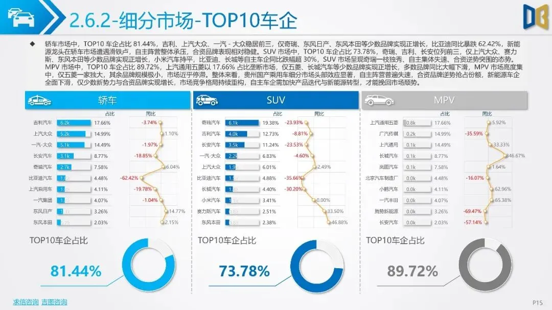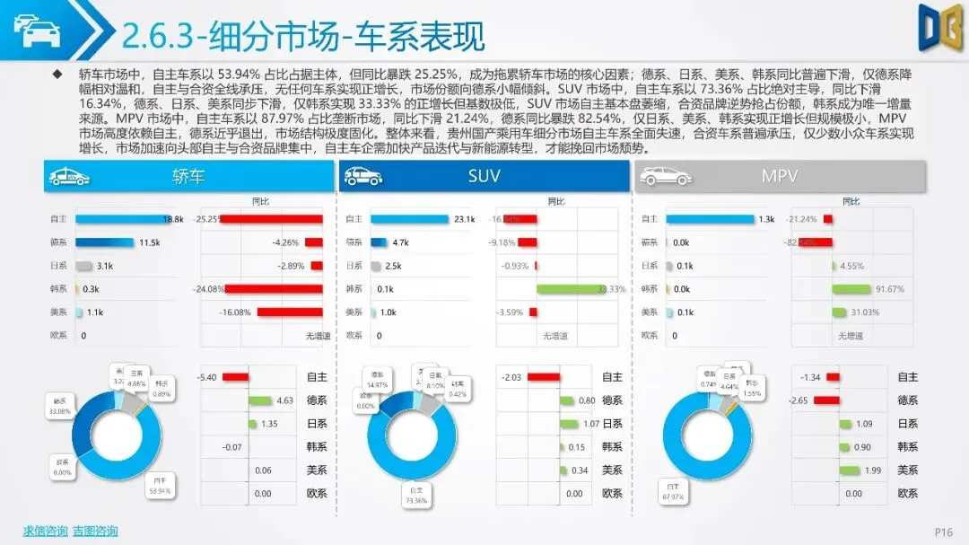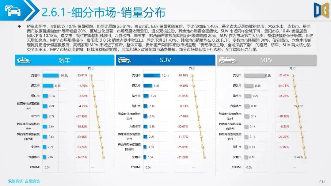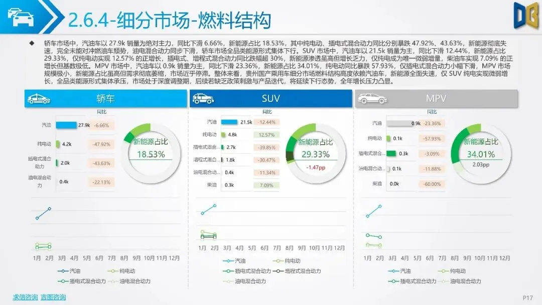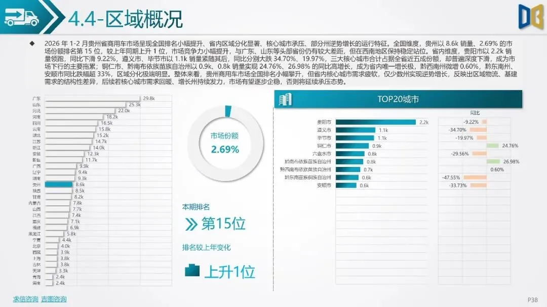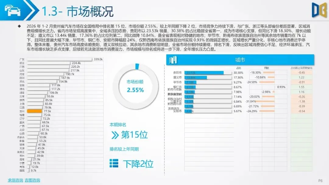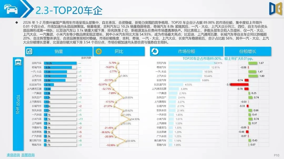 不过,商用车市场中新能源车型渗透提升,纯电动和CNG车型实现逆势增长。分城市看,贵阳、遵义为市场双核,但整体市场复苏动能不足。车企方面,吉利、奇瑞等自主品牌占据前列,但市场份额普遍下滑,新势力品牌成为唯一增量。整体来看,贵州省汽车市场增长乏力,需政策刺激与消费提振以推动市场复苏。