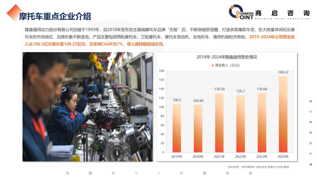 隆鑫通用动力股份有限公司创建于1993年,自2018年发布自主高端摩托车品牌“无极”后,不断突破舒适圈,打造多款爆款车型,在大排量休闲玩乐摩托车的市场地位、品牌形象不断进击。产品主要包括两轮摩托车、三轮摩托车、摩托车发动机、全地形车、通用机械和充电桩。2019-2024年公司营业收入从106.5亿元增长至168.22亿元,五年间CAGR为7%,收入保持稳定成长性。