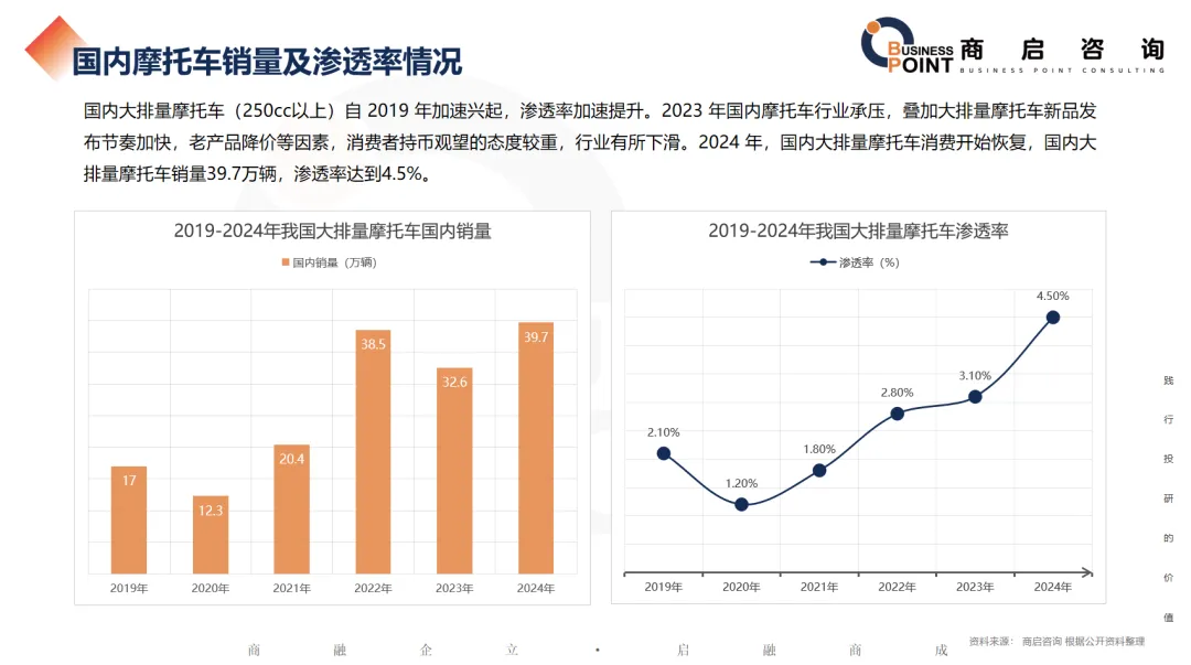 A:2024年国内大排量摩托车(250cc以上)内销量为39.7万辆;其在中国摩托车整体内销中的渗透率约为4.5%。