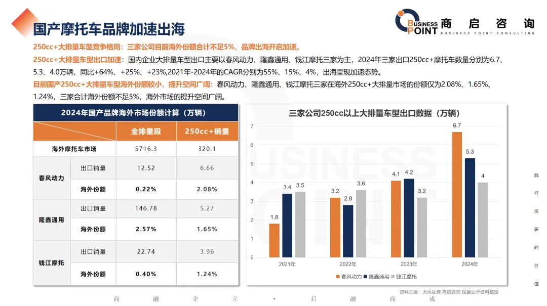 250cc+大排量车型竞争格局:三家公司目前海外份额合计不足5%,品牌出海开启加速。
