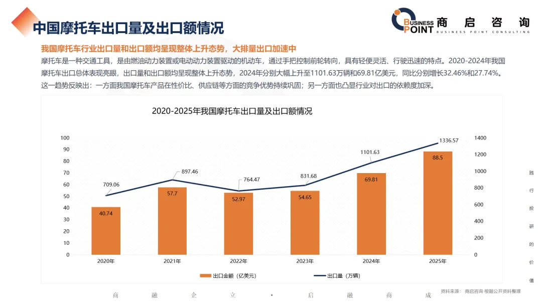 摩托车是一种交通工具,是由燃油动力装置或电动动力装置驱动的机动车,通过手把控制前轮转向,具有轻便灵活、行驶迅速的特点。2020-2024年我国摩托车出口总体表现亮眼,出口量和出口额均呈现整体上升态势,2024年分别大幅上升至1101.63万辆和69.81亿美元,同比分别增长32.46%和27.74%。这一趋势反映出:一方面我国摩托车产品在性价比、供应链等方面的竞争优势持续巩固;另一方面也凸显行业对出口的依赖度加深。