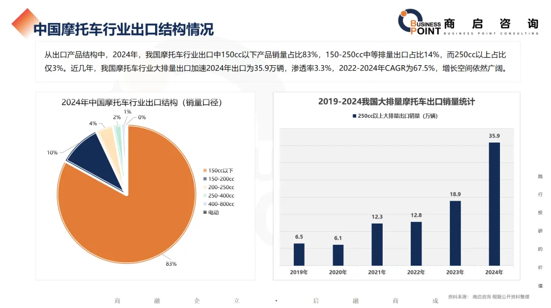 从出口产品结构中,2024年,我国摩托车行业出口中150cc以下产品销量占比83%,150-250cc中等排量出口占比14%,而250cc以上占比仅3%。近几年,我国摩托车行业大排量出口加速2024年出口为35.9万辆,渗透率3.3%,2022-2024年CAGR为67.5%,增长空间依然广阔。