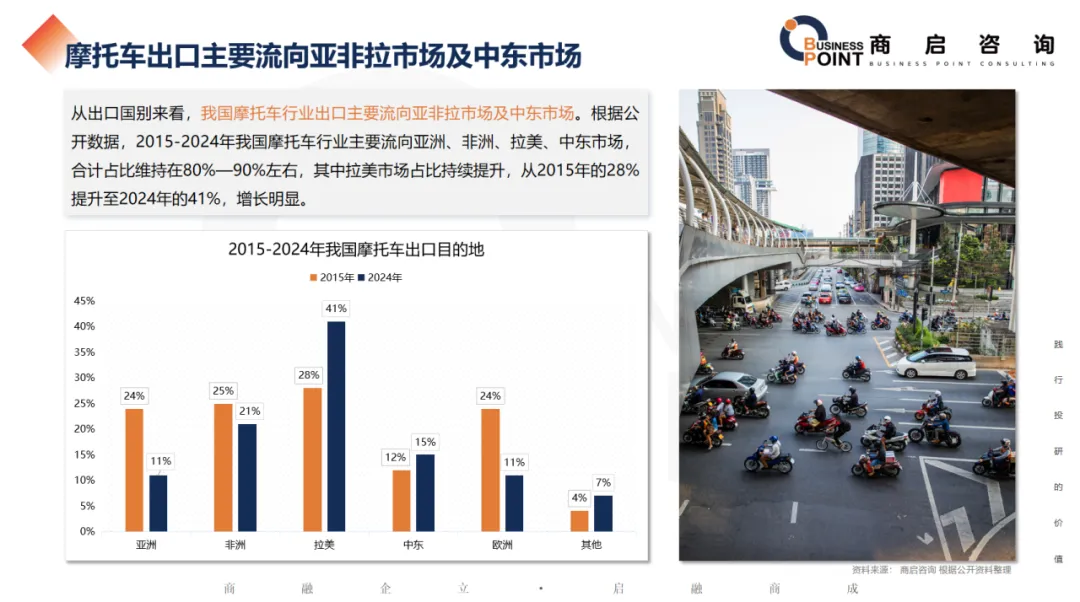 从出口国别来看,我国摩托车行业出口主要流向亚非拉市场及中东市场。根据公开数据,2015-2024年我国摩托车行业主要流向亚洲、非洲、拉美、中东市场,合计占比维持在80%—90%左右,其中拉美市场占比持续提升,从2015年的28%提升至2024年的41%,增长明显。