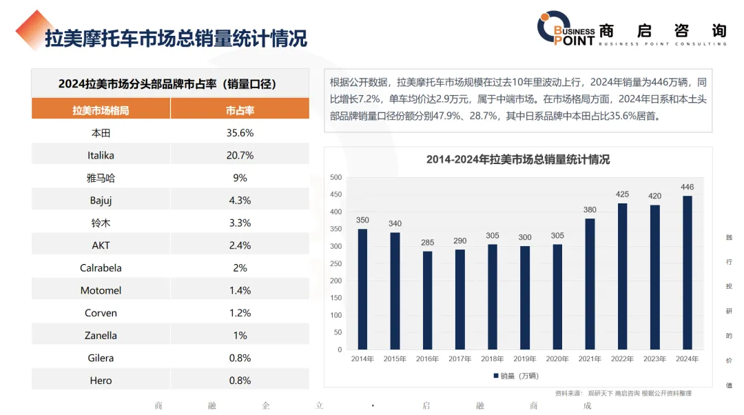 根据公开数据,拉美摩托车市场规模在过去10年里波动上行,2024年销量为446万辆,同比增长7.2%,单车均价达2.9万元,属于中端市场。在市场格局方面,2024年日系和本土头部品牌销量口径份额分别47.9%、28.7%,其中日系品牌中本田占比35.6%居首。