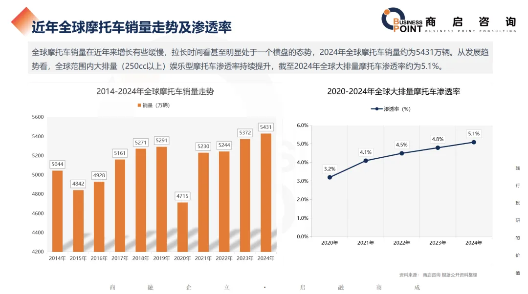 全球摩托车销量在近年来增长有些缓慢,拉长时间看甚至明显处于一个横盘的态势,2024年全球摩托车销量约为5431万辆。从发展趋势看,全球范围内大排量(250cc以上)娱乐型摩托车渗透率持续提升,截至2024年全球大排量摩托车渗透率约为5.1%。