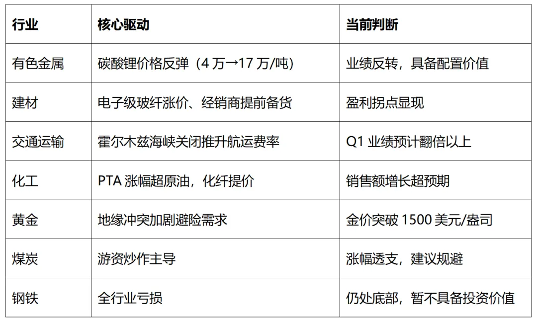 嘉宾指出,周期股投资应把握PPI修复拐点,重点关注以下行业在2026年Q1的业绩反转信号:
