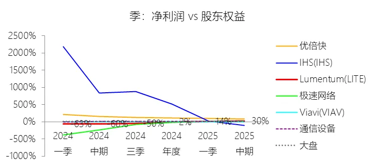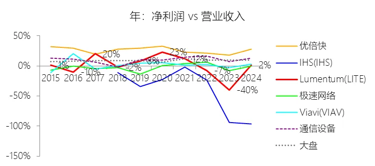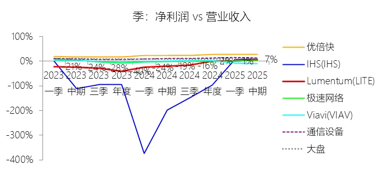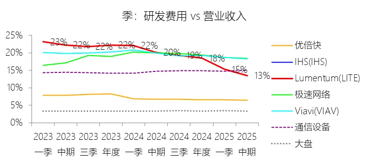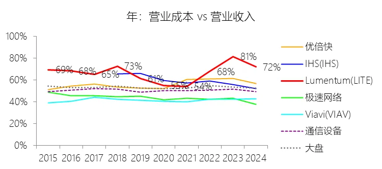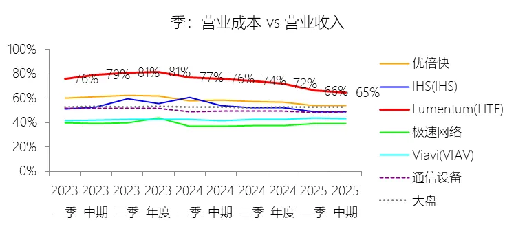 2026财年中期,Lumentum实现营业收入11.99亿美元,同比大幅增长62.26%,增速较上年同期提升54.27个百分点,在通信设备行业中表现突出。此轮增长的核心驱动力来自云计算与人工智能(AI)基础设施需求的爆发式扩张——激光芯片和激光组件受益于向200G通道速度的技术迁移而出货量大幅攀升;与此同时,网络设备制造商在经历2024财年去库存压力后库存趋于正常化,叠加收购Cloud Light所带来的新增收入贡献,共同推动了短期营收的快速回升。从长期维度看,2016至2025财年(九年),公司营收年复合增长率为6.89%,高于通信设备行业均值2.26个百分点,但整体增速呈下降趋势,主要原因在于光通信市场日益成熟与商品化,以及来自亚太地区竞争对手带来的持续价格压力。盈利能力方面,本期毛利率显著改善,营业成本率降至64.85%,同比下降11.14个百分点,仍高于行业均值约15.61个百分点,反映出公司制造环节的重资产属性与相对较高的供应链成本。营销费用率(15.11%)和研发费用率(13.47%)均因收入规模扩大而同比明显下降,但在行业横向对比中仍略高于均值,体现了公司持续的研发投入力度。受上述因素共同作用,净利润在本期实现扭亏为盈,达0.82亿美元,净利率为6.87%,同比上升约26个百分点。从长期看,公司十年平均净利率(1.35%)低于行业均值8.75个百分点,主要源于历次大型并购所产生的巨额无形资产摊销、库存增值调整及重组支出的持续拖累。二、资产负债表:规模扩张与杠杆高企并存