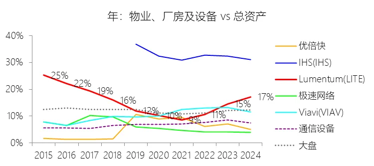 总资产增长率:2026财年中期末,Lumentum的总资产为48.05亿美元,对比年初增长13.9%,增速同比(去年同期)上升13.03个百分点;2016-2025财年(九年)增长480.85%,年复合增长21.59%,比通信设备行业的复合增速高16.05个百分点,长期呈下降趋势。增速短期上升主要由于云和人工智能(AI)基础设施需求的爆发式增长,带动了公司应收账款和存货规模随订单量的增加而显著扩张;同时,公司为满足日益增长的需求,持续投资于内部和外部制造能力(如日本厂房的购置),且在2026财年第一季度通过发行2032年到期的可转换票据显著提升了现金及投资余额。增速长期下降主要由于公司在业务转型过程中主动退出或剥离了部分利润较低的业务(如收发器模块和铌酸锂调制器产品线),导致相关长期资产被处置、减值或摊销完毕;此外,随着公司资产总额在多次大型并购后基数显著增大,宏观经济波动及部分终端市场(如成像传感)的竞争加剧也限制了资产的持续内生增速。增速高于通信设备行业的复合增速主要由于公司实施了积极的行业整合战略,通过对Oclaro、NeoPhotonics及Cloud Light等公司的一系列大规模并购,实现了资产规模的跨越式扩张;同时,公司长期深耕于ROADM、高速光芯片及3D传感等高技术门槛且高增长的核心市场,并通过全球制造布局的持续优化(如泰国工厂扩建),使其资本投入强度远高于行业平均水平。