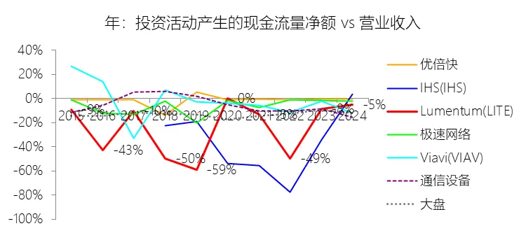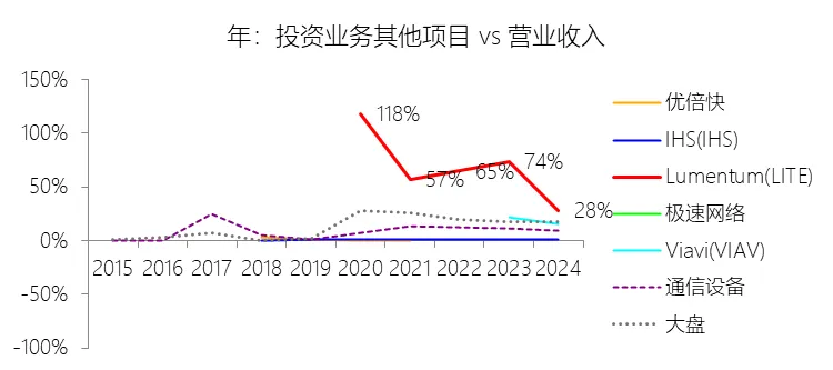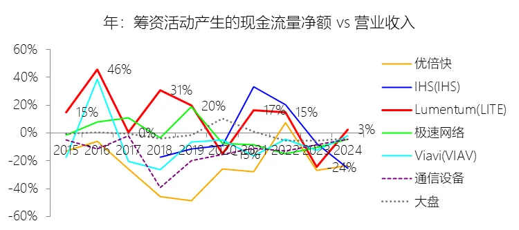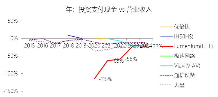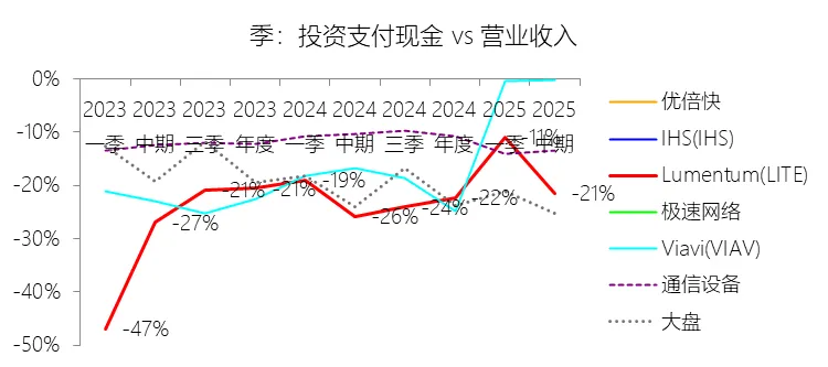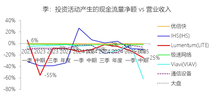 经营活动产生的现金流量净额:2026财年中期,Lumentum的经营活动产生的现金流量净额为1.85亿美元,同比增长188.89%,与营业收入的比例为15.39%,同比上升6.75个百分点;2016-2025财年(十年),此项合计为28.02亿美元,平均比例为19.16%,比通信设备行业的均值低0.09个百分点,长期呈下降趋势。购买无形资产及其他资产支付的现金:2026财年中期,Lumentum的购买无形资产及其他资产支付的现金缺数据,与营业收入的比例无效;2016-2025财年(十年),此项合计为-31.61美元,平均比例为-21.62%,比通信设备行业的均值低8.5个百分点,长期呈下降趋势。投资支付现金:2026财年中期,Lumentum的投资支付现金为-2.58亿美元,绝对值同比增长35.24%,与营业收入的比例为-21.47%,同比上升4.29个百分点;2016-2025财年(十年),此项合计为-47.61亿美元,平均比例为-32.56%,比通信设备行业的均值低23.19个百分点,长期呈上升趋势。投资业务其他项目:2026财年中期,Lumentum的投资业务其他项目为1.18亿美元,同比减少47.95%,与营业收入的比例为9.84%,同比下降20.83个百分点;2016-2025财年(十年),此项合计为56.48亿美元,平均比例为38.63%,比通信设备行业的均值高29.63个百分点,长期呈下降趋势。投资活动产生的现金流量净额:2026财年中期,Lumentum的投资活动产生的现金流量净额为-2.99亿美元,绝对值同比增长284.58%,与营业收入的比例为-24.95%,同比下降14.42个百分点;2016-2025财年(十年),此项合计为-37.00亿美元,平均比例为-25.30%,比通信设备行业的均值低19.26个百分点,长期呈上升趋势。贷款收益:2026财年中期,Lumentum的贷款收益为12.98亿美元,同比增长1662.91%,与营业收入的比例为108.19%,同比上升98.23个百分点;2016-2025财年(十年),此项合计为20.07亿美元,平均比例为13.72%,比通信设备行业的均值高10.07个百分点,长期呈下降趋势。筹资活动产生的现金流量净额:2026财年中期,Lumentum的筹资活动产生的现金流量净额为2.52亿美元,同比增长342.18%,与营业收入的比例为20.98%,同比上升13.28个百分点;2016-2025财年(十年),此项合计为14.02亿美元,平均比例为9.59%,比通信设备行业的均值高22.22个百分点,长期呈下降趋势。期末现金及现金等价物余额:2026财年中期末,Lumentum的期末现金及现金等价物余额为6.58亿美元,对比年初增长26.31%,与总资产的比例为13.69%,同比上升1.59个百分点;2016-2025财年(十年),此项与总资产的平均比例为18.10%,比通信设备行业的均值高4.82个百分点,长期呈下降趋势。第5章估值