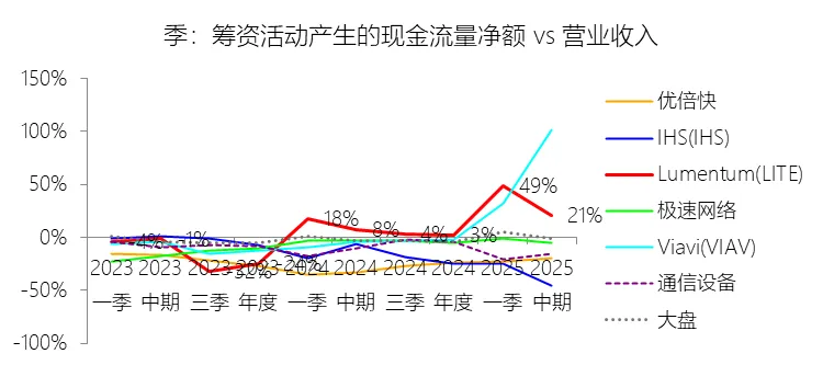 截至2026财年中期末,Lumentum总资产为48.05亿美元,较年初增长13.90%,增速同比提升13.03个百分点。资产扩张的主要来源是应收账款(3.77亿美元,较年初增长50.72%)、存货(5.70亿美元,较年初增长21.34%)以及短期投资(4.98亿美元,较年初增长39.62%)的同步扩大,反映出业务量快速回升带来的运营资产积累;同时,公司在2026财年第一季度发行了2032年到期的可转换票据,显著充实了现金及投资余额(期末现金及现金等价物为6.58亿美元,较年初增长26.31%)。物业、厂房及设备(8.14亿美元)保持稳健增长,显示公司持续投资于内部和外部制造产能。负债端,总负债升至39.59亿美元,负债率高达82.38%,较年初上升4.38个百分点,远超公司十年历史均值(57.76%)及行业均值,显著高企。负债率短期跳升的关键原因在于,因股价大幅上涨触发转换条款,包括2026、2028、2029及2032年到期的多笔可转换高级票据(合计约31.83亿美元)从非流动负债重新分类为流动负债,短期债务及一年内到期长期负债骤增至32.40亿美元,较年初增幅超过30,000%。这一会计重分类虽在一定程度上是技术性因素所致,但由此带来的再融资压力仍需密切关注。股东权益方面,受股票回购、可转换票据部分回购产生的公允价值调整及封顶呼叫期权结算等因素影响,期末股东权益较年初缩减约25.39%,降至8.47亿美元。盈利回升与权益基数缩小共同推动TTM净资产收益率(ROE)大幅反弹至29.72%,同比提升近90个百分点,但长期ROE水平(十年均值1.56%)仍低于行业均值12.11个百分点。三、现金流量:经营现金流转正,投融资活动活跃
