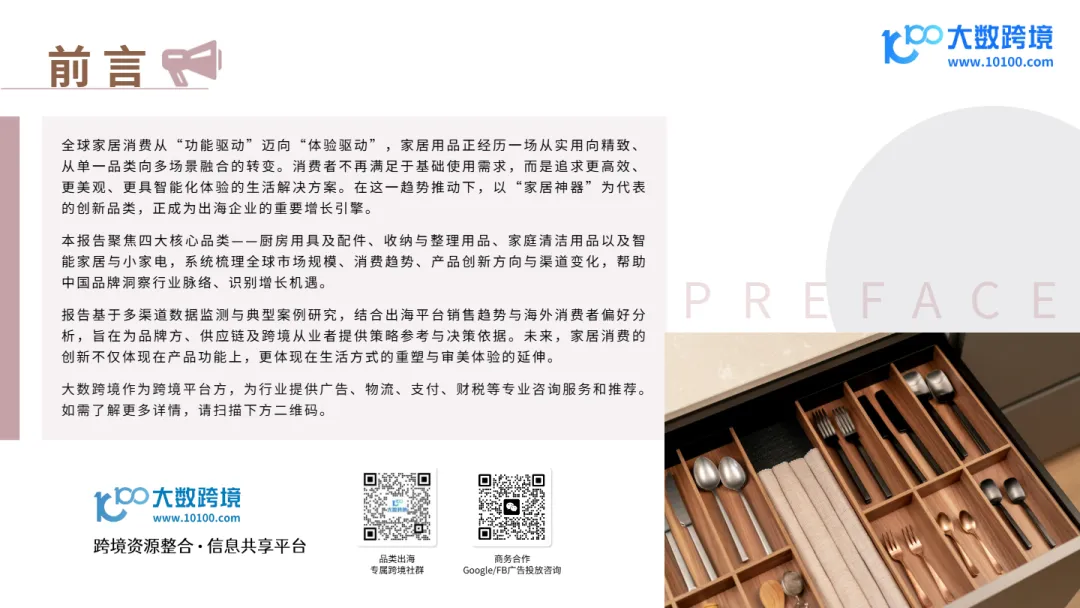 本文件深度剖析了2025年全球家居神器出海市场,为出海企业提供了从宏观趋势到微观爆款的全景式洞察。文件指出,随着全球家居消费从“功能驱动”转向“体验驱动”,中国品牌正迎来以“高效、智能、高颜值”为核心的家居新品类出海黄金窗口期,尤其在厨房用具、收纳整理、清洁工具与小家电赛道具备巨大增长潜力。