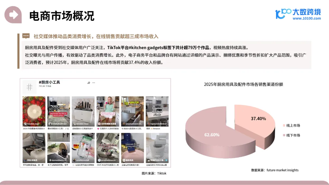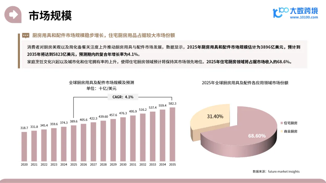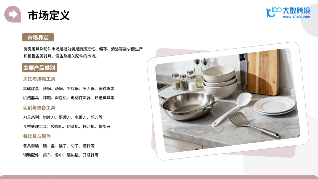 • 2025年全球厨房用具市场规模达3896亿美元,CAGR 4.1%:其中切割与准备工具占比最高(22.8%),压蒜器、刨丝器等“厨房神器”在TikTok等社交平台爆发式增长,单品可实现超千万美元GMV,成为DTC品牌突围利器。