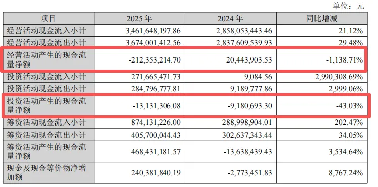 经营活动现金流净额为负,主要系存货备货与经营性应收项目增加合计占用资金超4.5亿元,而经营性应付项目增加仅0.98亿元,资金占用规模扩大所致,属于业务扩张期的阶段性现象。