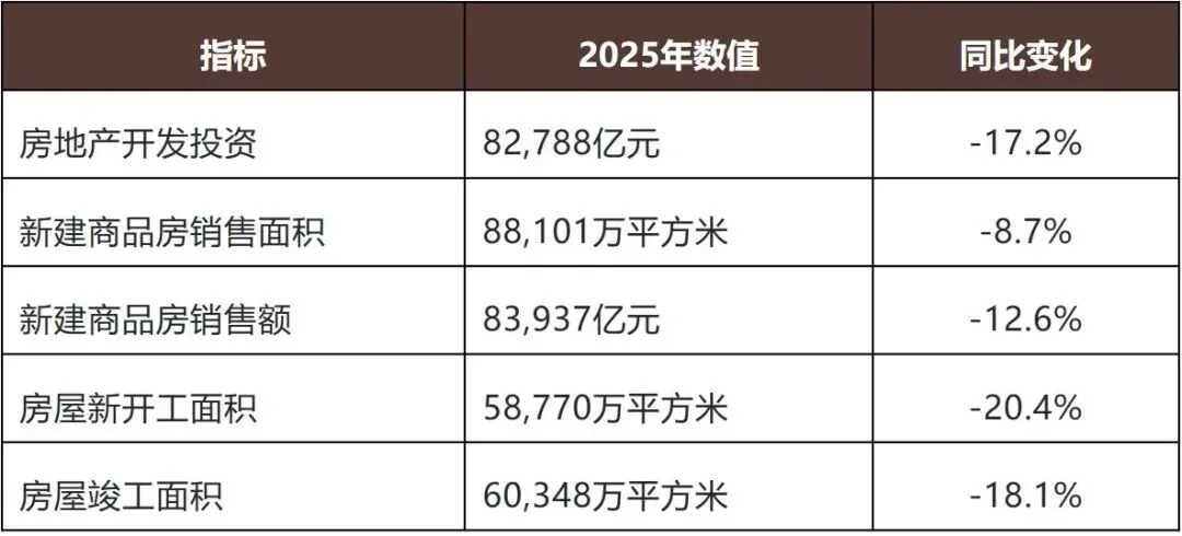22025年,房地产市场在政策持续托底与供需两端优化下,筑底企稳态势进一步明确,核心指标降幅持续收窄,市场交易活跃度稳步回升。根据国家统计局数据,2025年全国房地产开发投资82,788亿元,同比下降17.2%,降幅较2024年收窄2.1个百分点;新建商品房销售面积88,101万平方米,同比下降8.7%,销售额83,937亿元,同比下降12.6%,销售端降幅较2024年分别收窄5.3和4.8个百分点,其中一二线核心城市新建商品房销售面积同比实现正增长,涨幅达3.2%[1]。